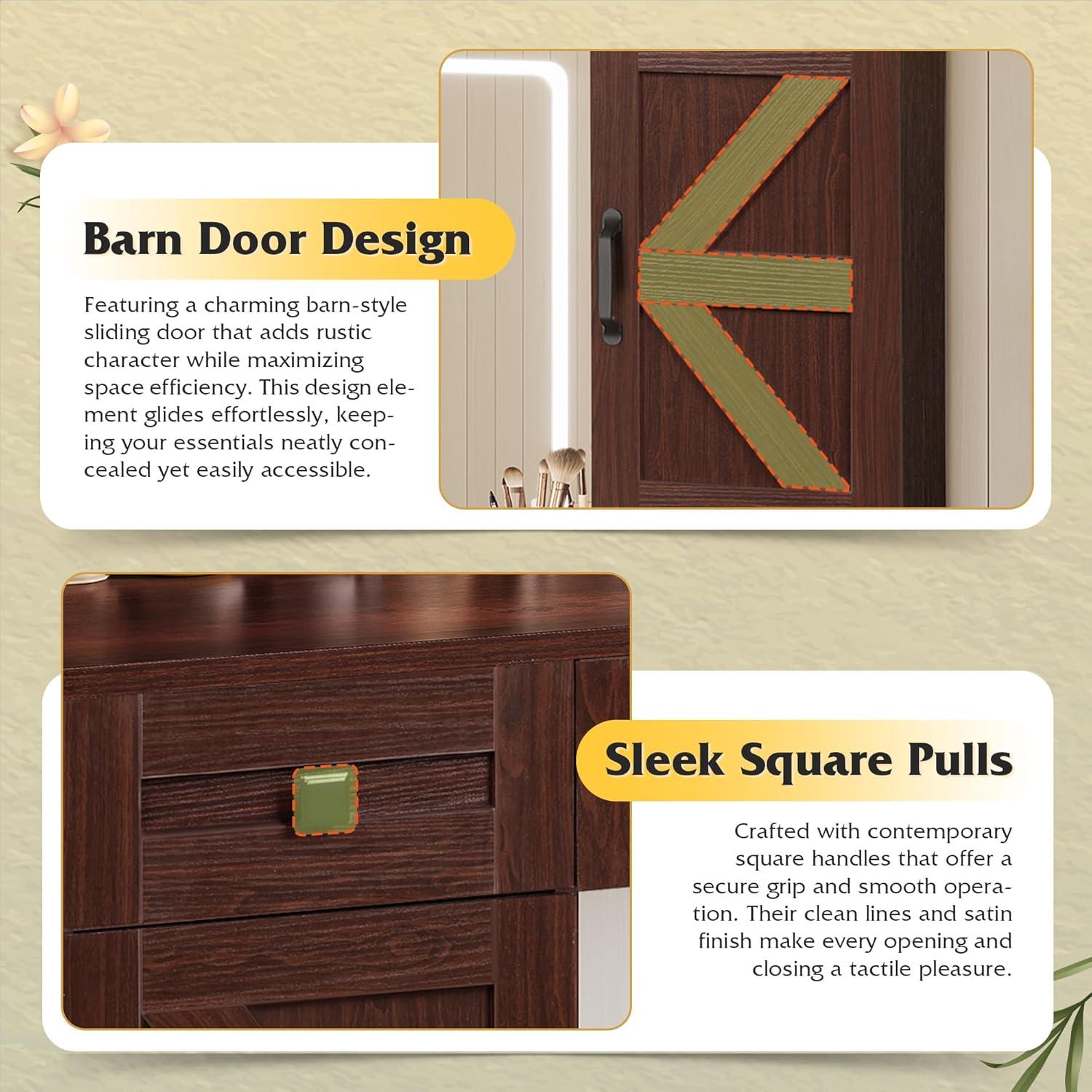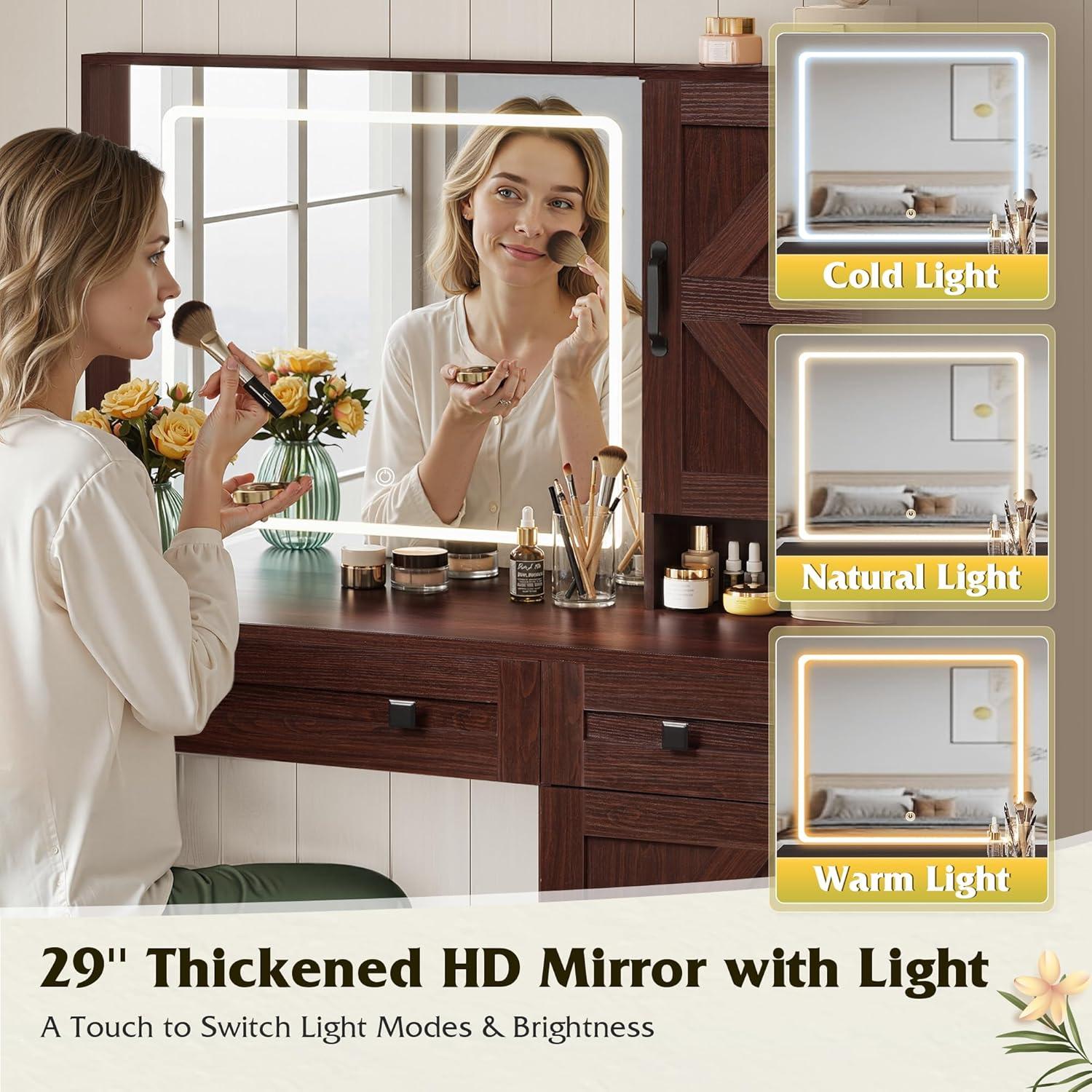 【Rustic Vanity Desk】This wooden vanity blends classic farmhouse charm with modern function. The large mirror is framed by a touch-control LED light, offering 3 light modes. Create the perfect ambiance for any task, from precise makeup application to creating a cozy glow.