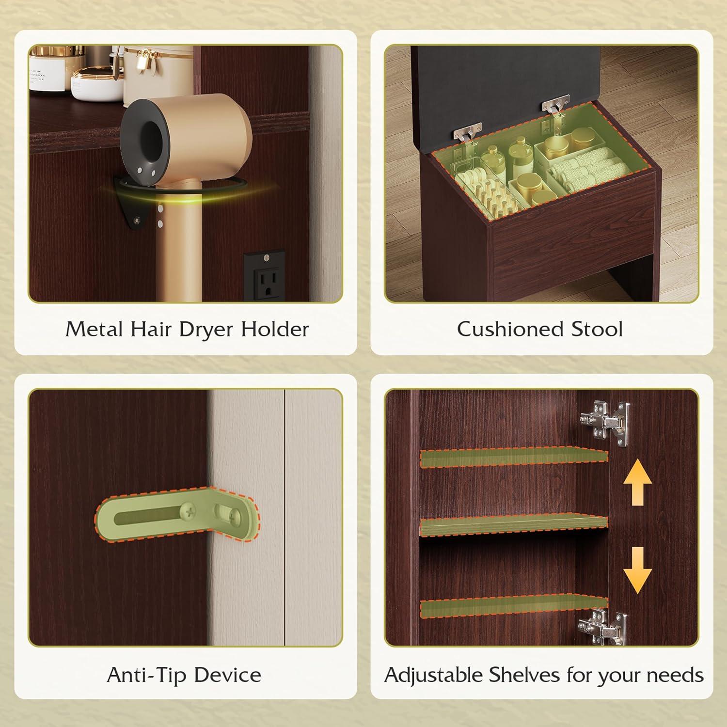 【Built-In Outlets & Hair Dryer Holder】The makeup table is designed with 2 AC outlets and 2 USB ports for your devices. The side-mounted hair dryer holder keeps it handy, letting you style your hair at your vanity without ever searching for a free power socket.