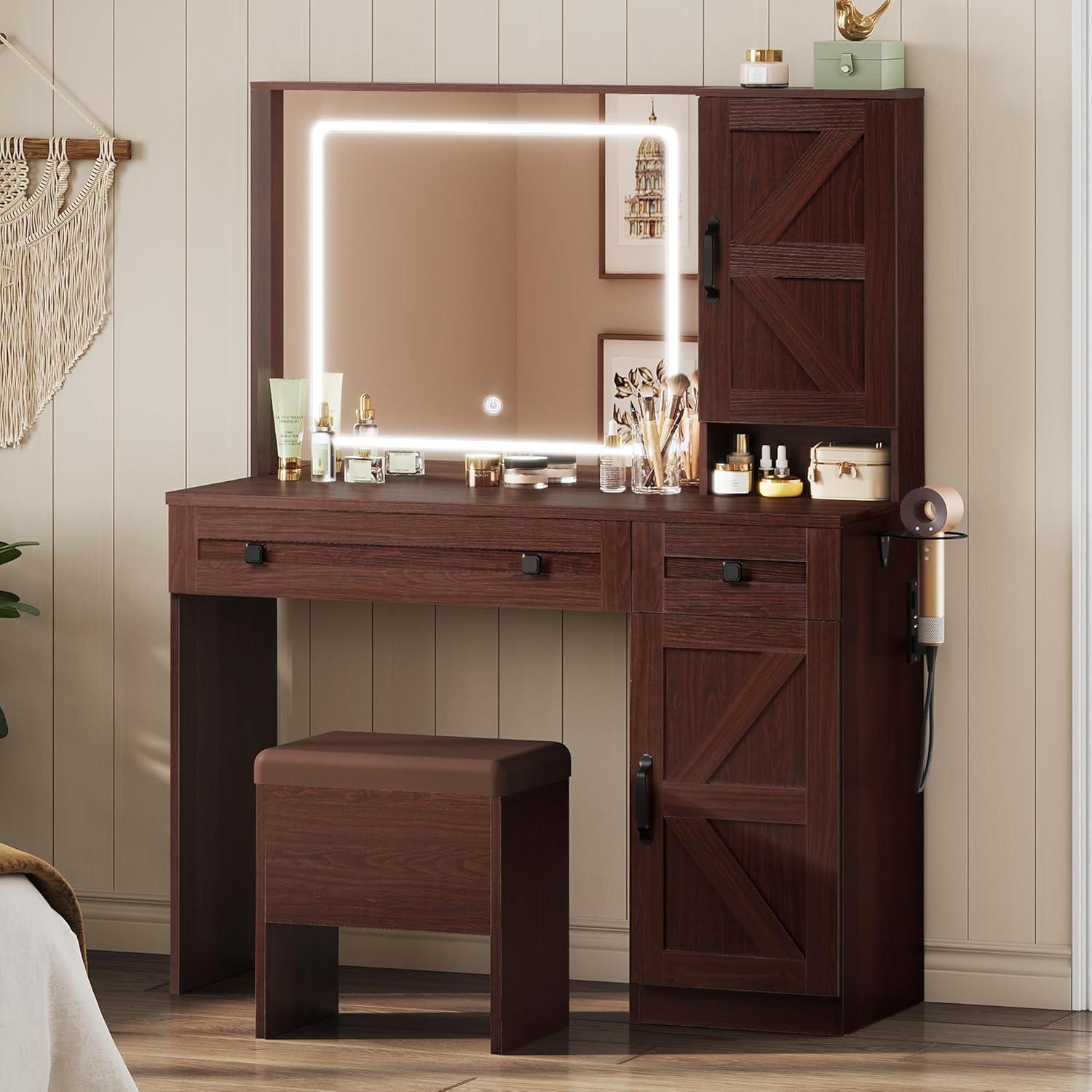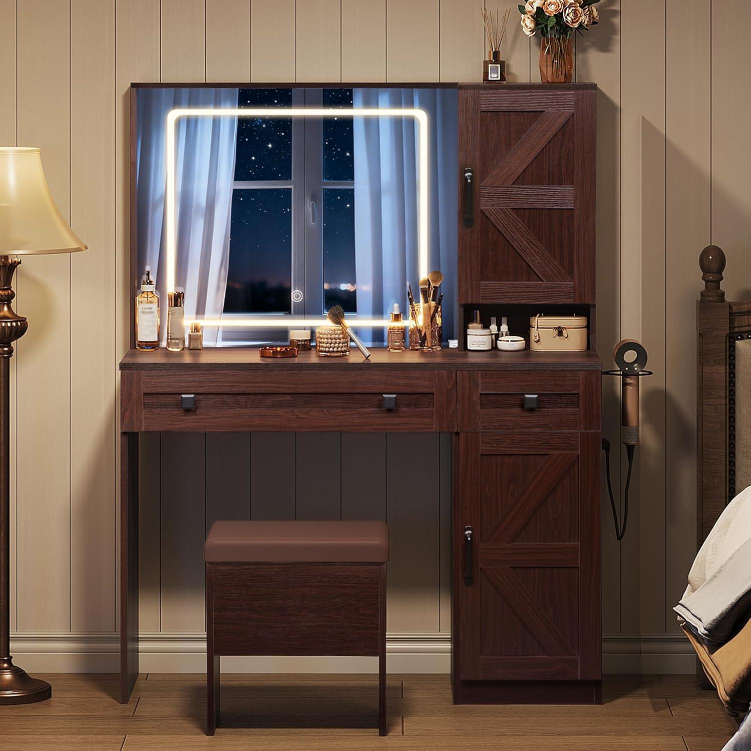 WLIVE Farmhouse Vanity Desk with Mirror and Lights, Makeup Table with Charging Station, 2 Drawers and 2 Cabinets, Vanity Set with Hair Dryer Holder for Bedroom, White(Espresso)