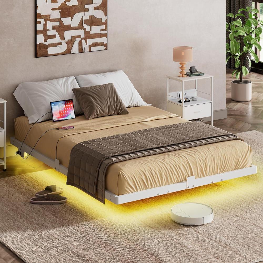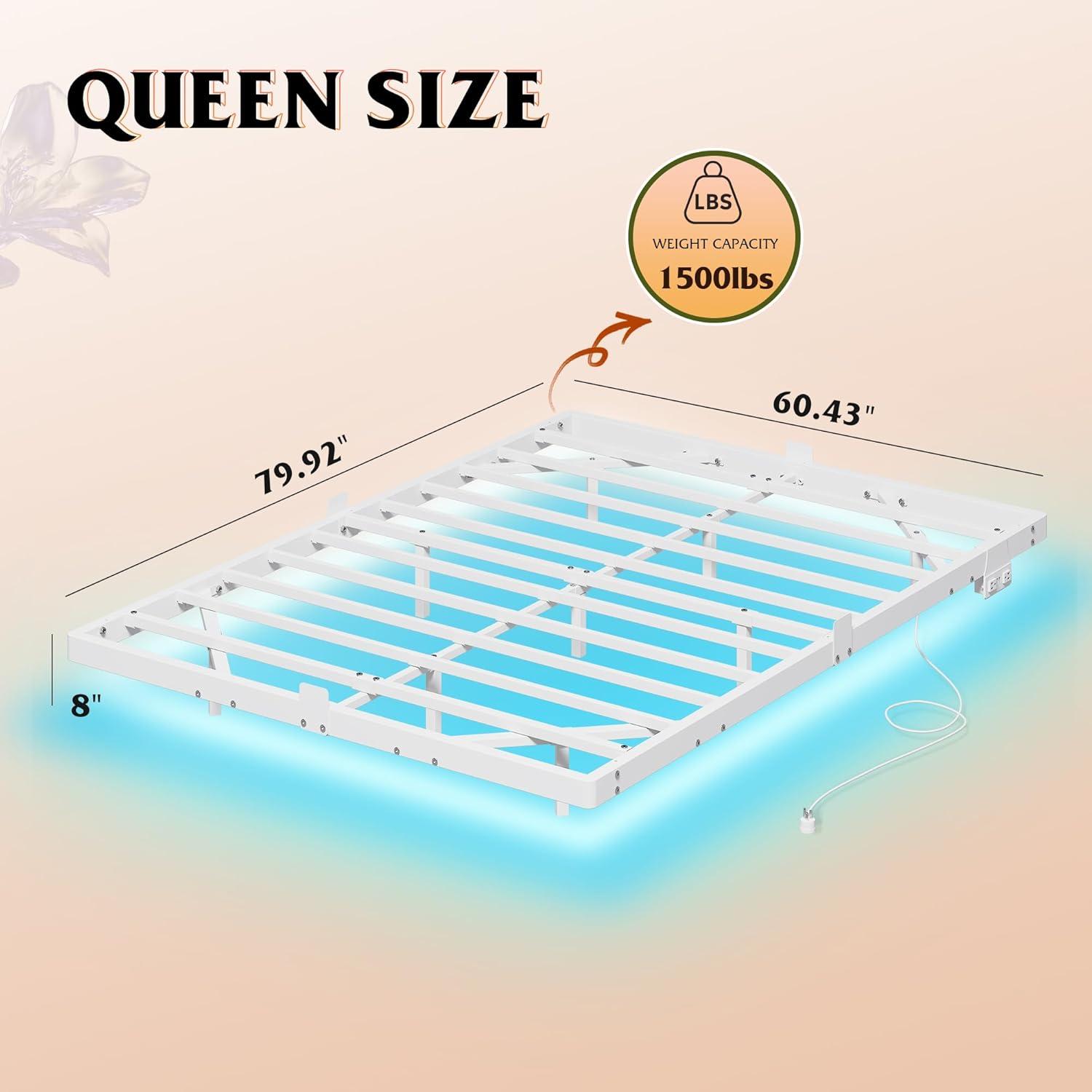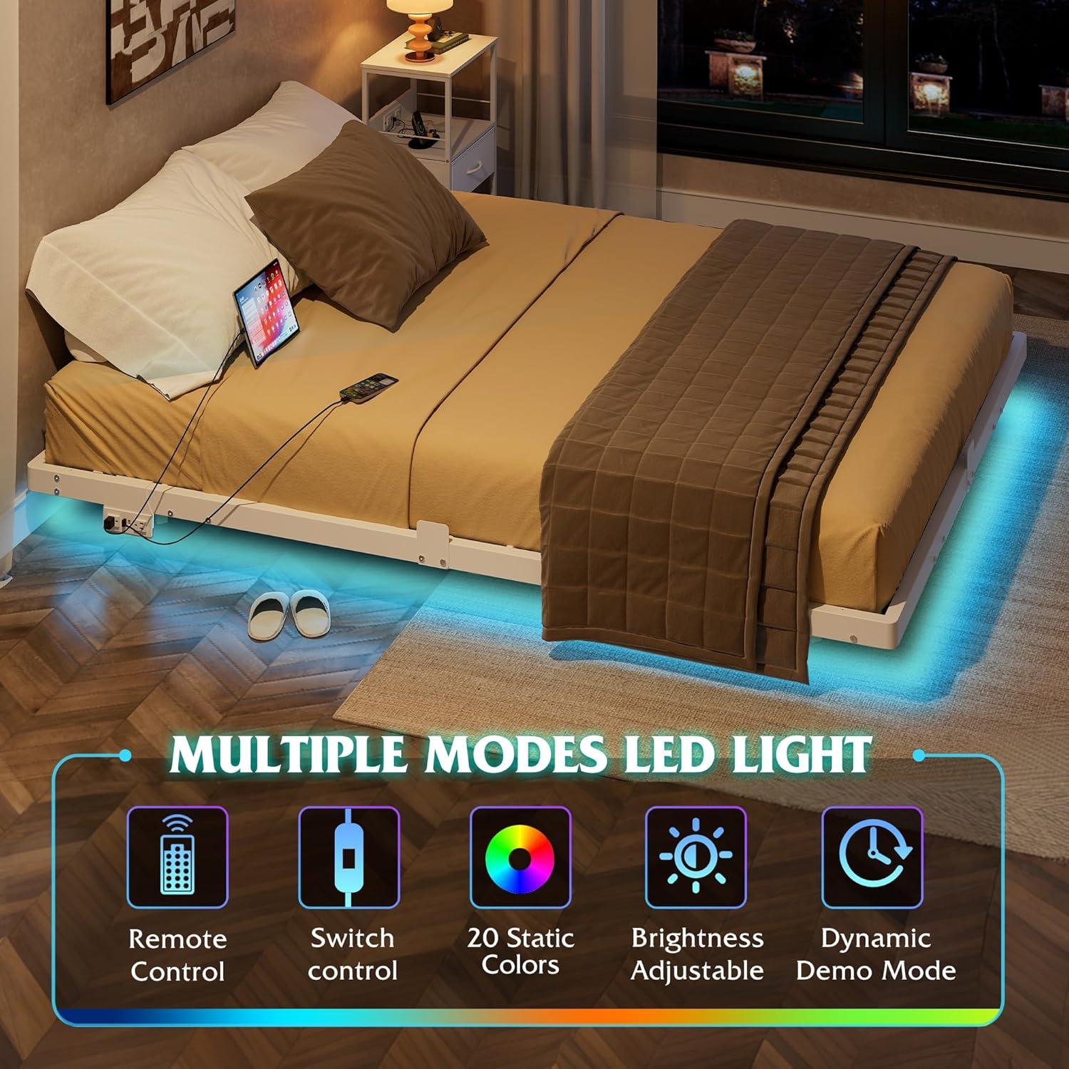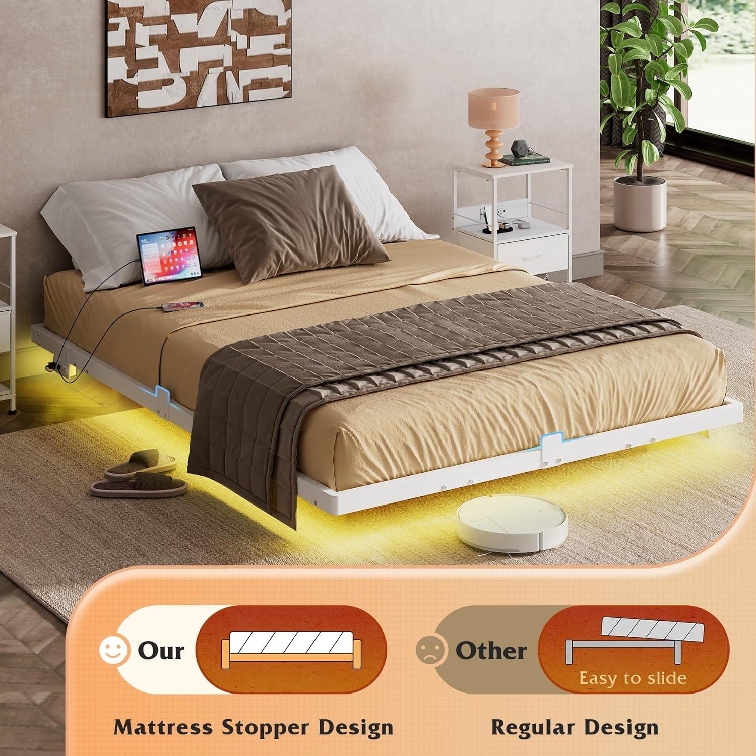 WLIVE Floating Queen Bed Frame, LED Bed Frame with Charging Station, Metal Platform Beds Queen Size with Heavy Duty Steel Slats, No Box Spring Needed, Easy Assembly, No Noise, Black(White)
