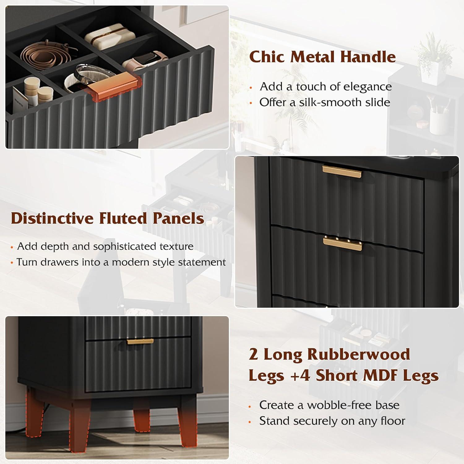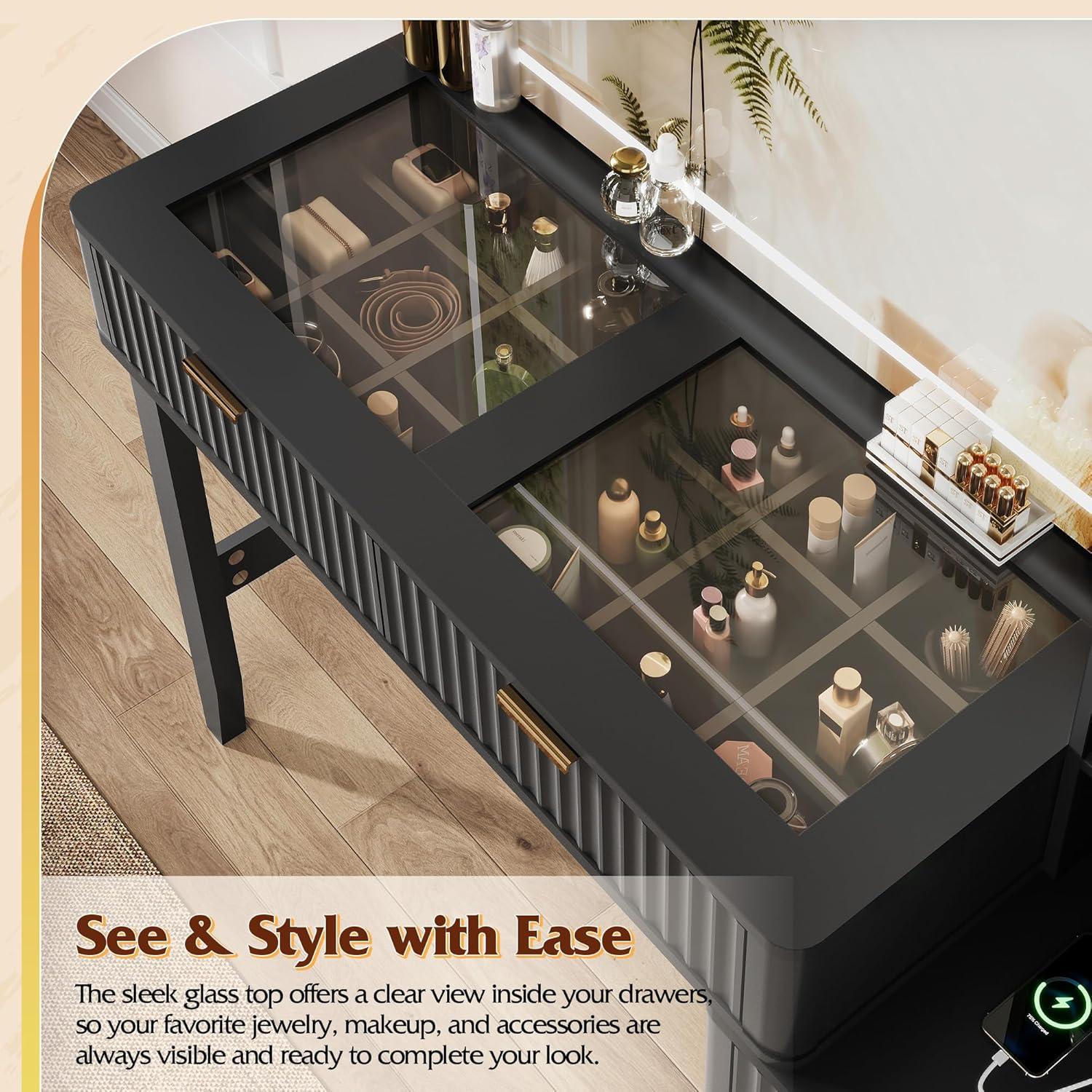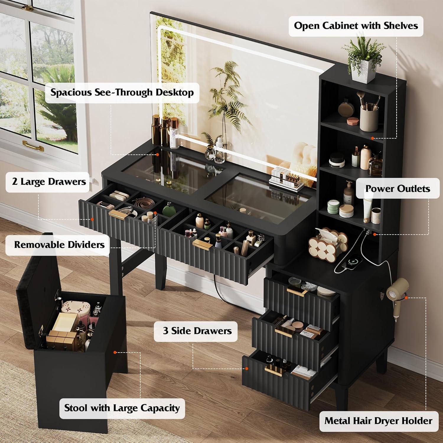 WLIVE Fluted Vanity Desk with Mirror and Lights, Makeup Table with 5 Drawers and Storage Shelves, Bedroom Dressing Table with Charging Station, Black(Black)