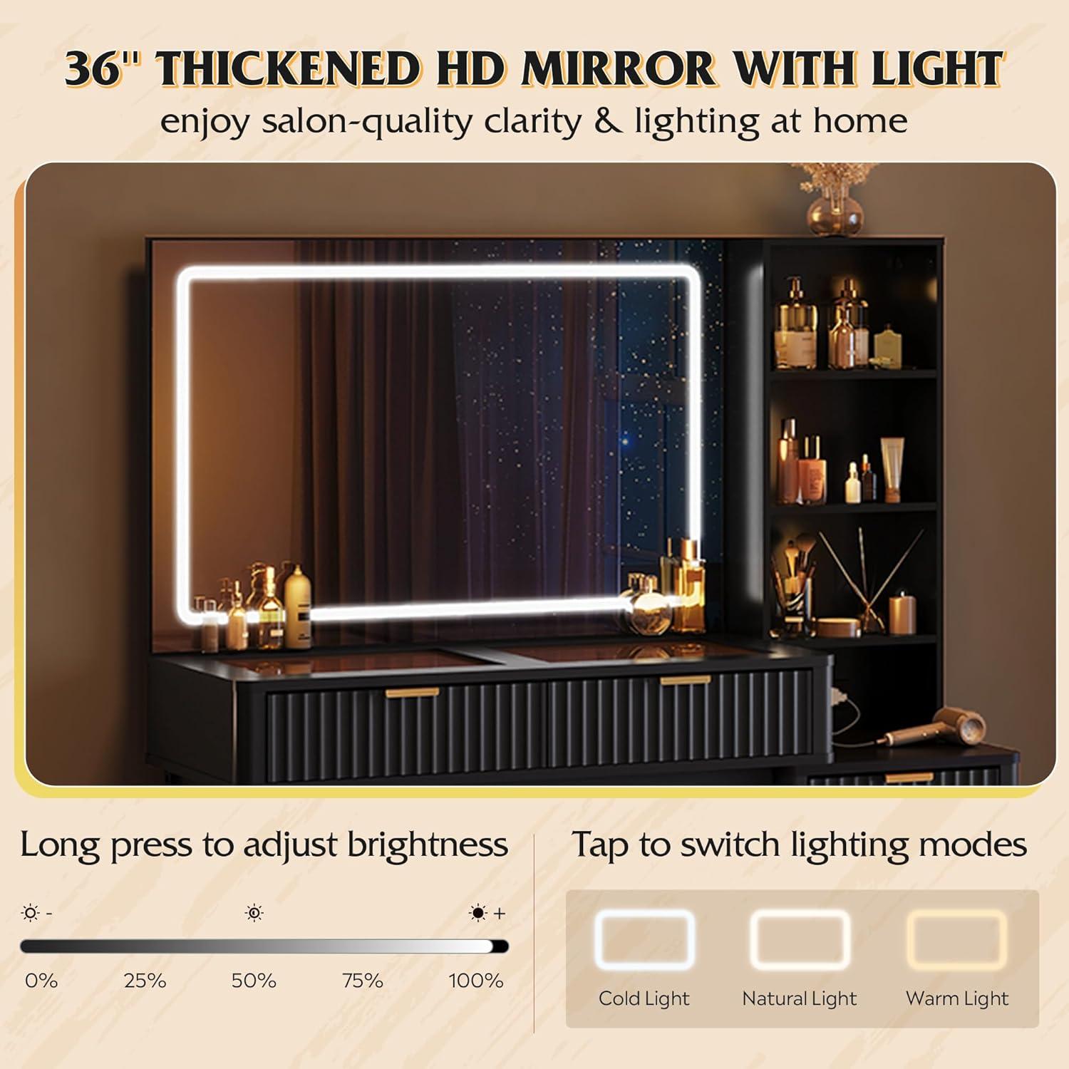 【Adjustable Lights】The large vanity mirror with lights features 3 color modes and dimmable brightness—just press and hold to adjust. The generous 36″W mirror gives you a perfect view to check your makeup and outfits from every angle.