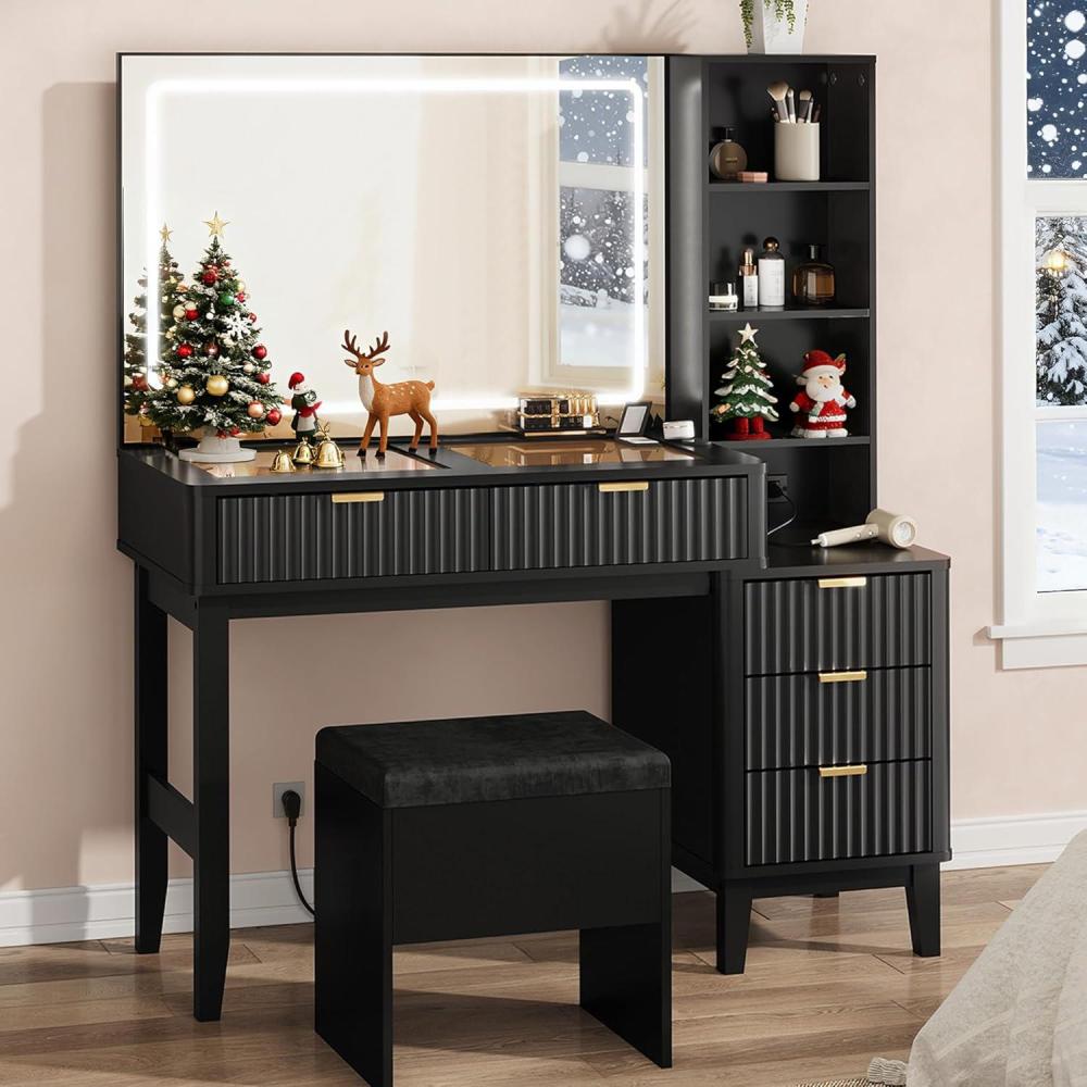 Be the first to review “WLIVE Fluted Vanity Desk with Mirror and Lights, Makeup Table with 5 Drawers and Storage Shelves, Bedroom Dressing Table with Charging Station, Black(Black)”