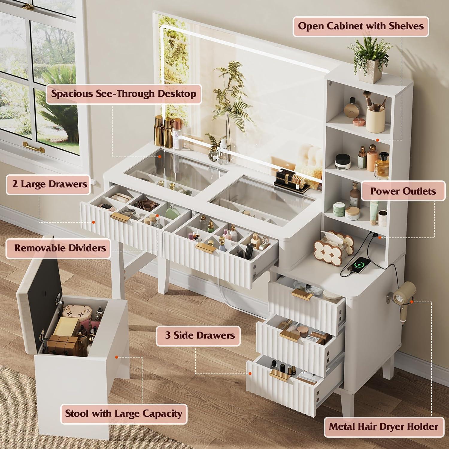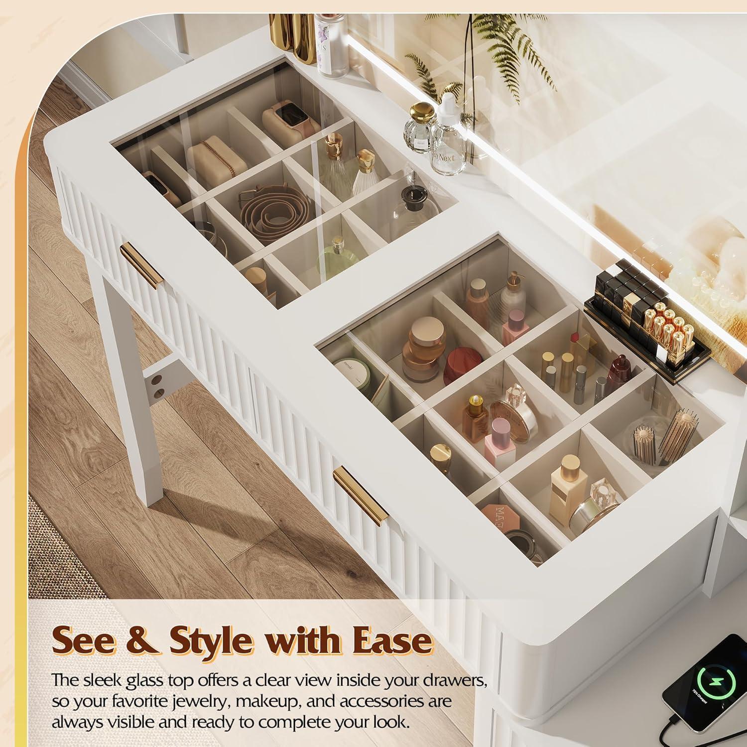 【Ample Storage】This vanity desk with drawers is designed for neatness. The glass top makes items easy to find, while wooden dividers in 2 large drawers keep jewelry tangle-free. It also includes 3 smooth drawers and 4 open shelves for all your skincare and essentials.