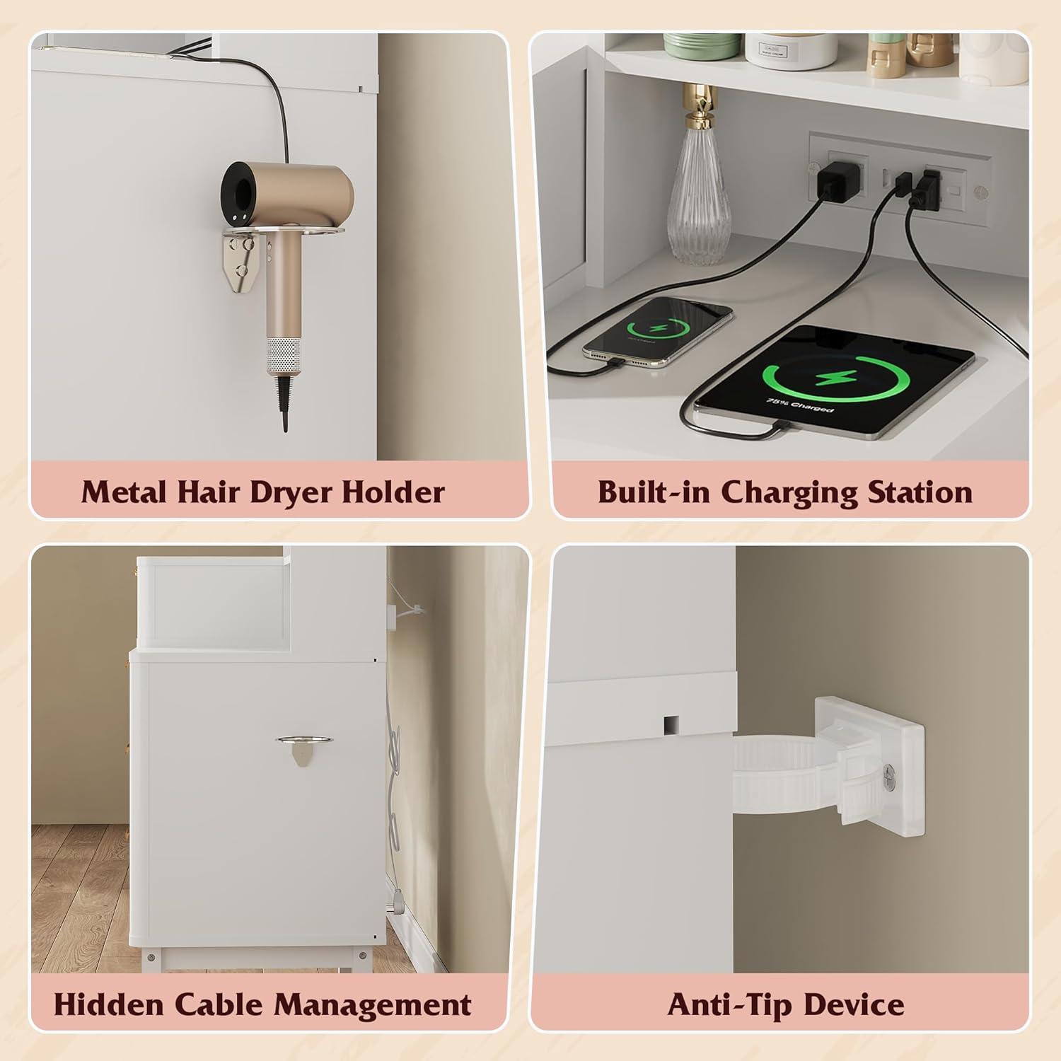 【Convenient Power】The makeup vanity with lights and mirror has a built-in charging station with 2 AC outlets and 2 USB ports. The side hair dryer holder lets you style your hair right at your vanity table, making your routine effortless.