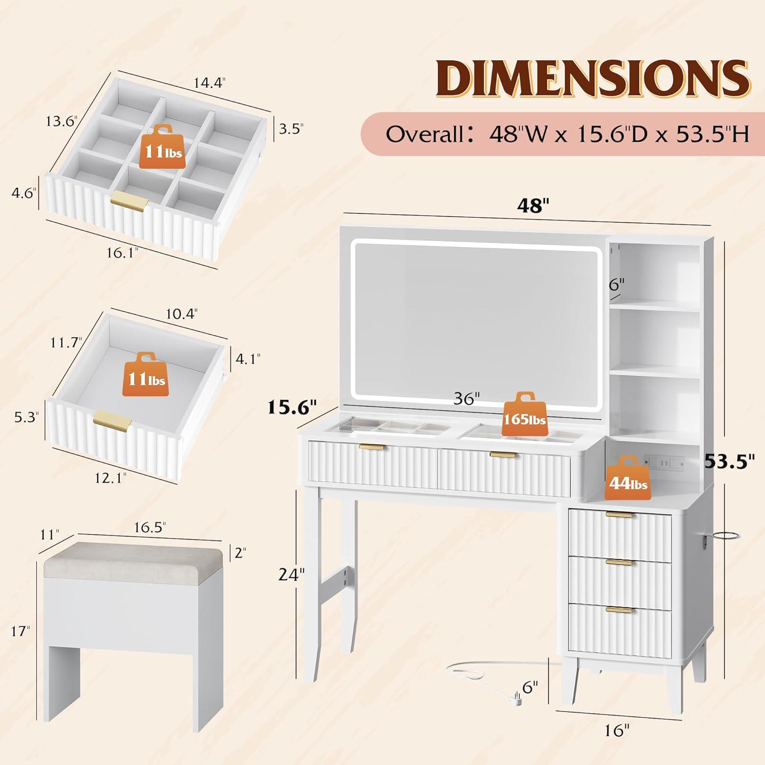 【Modern & Practical】With its elegant wave-pattern details and compact size (48″W x 15.6″D), the makeup table with storage fits perfectly in bedrooms and closets. It adds a touch of stylish organization to your space, helping you create a warm and tidy atmosphere.
