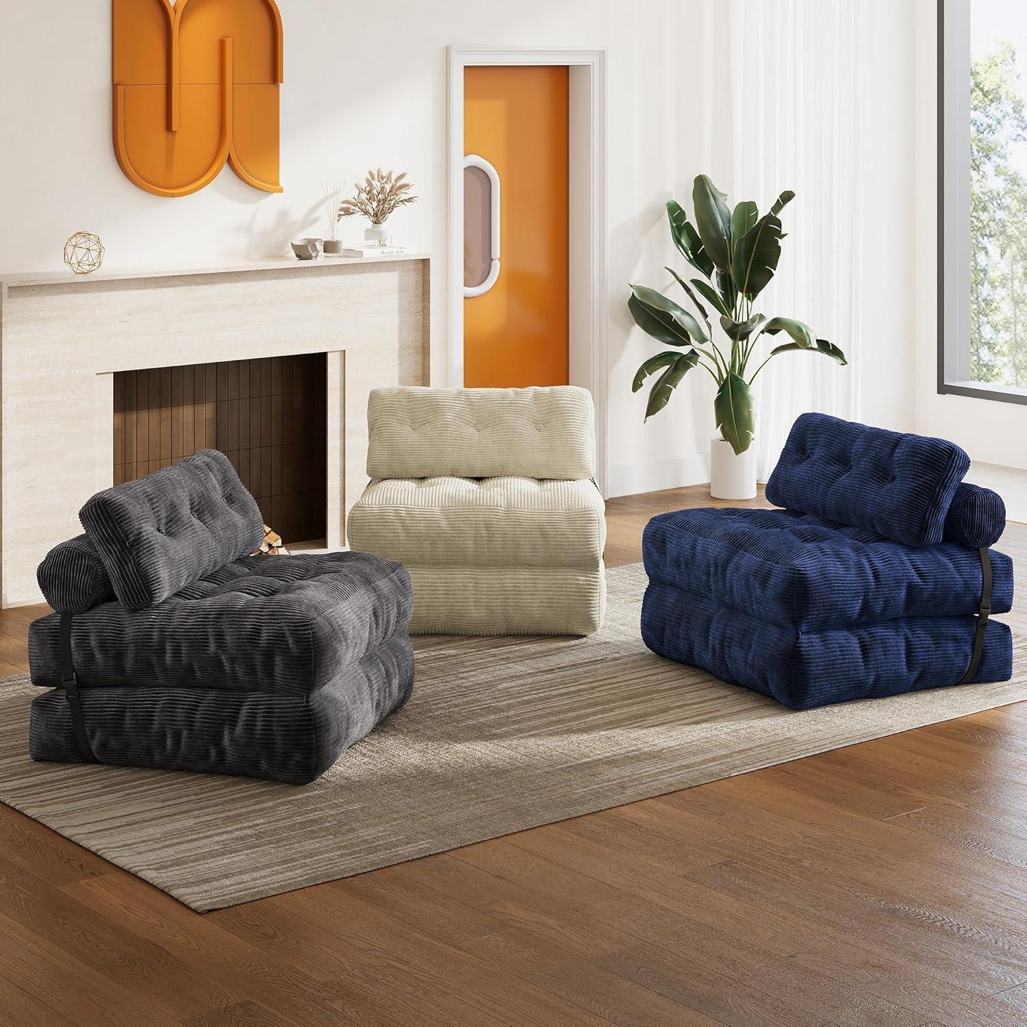 WLIVE Futon Sofa Bed, Floor Chair with Adjustable Backrest, Bean Bag Bed for Adults, with Armrest, Pillow, Low Profile for Living Room, Reading, Bedroom, Single, Beige(Navy Blue)