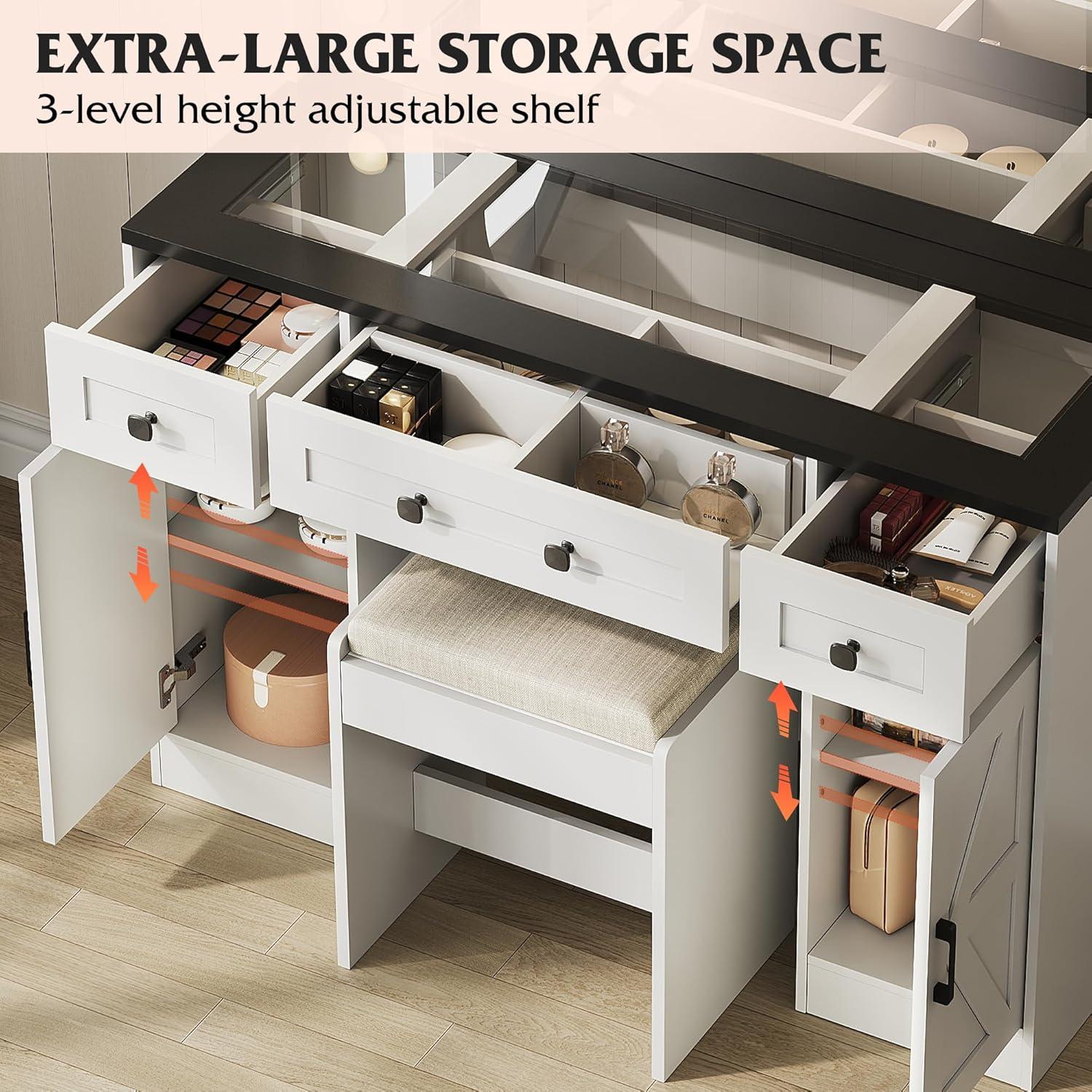 【Massive Storage】This white vanity with lighted mirror features 5 drawers, 2 side shelves, and a storage cabinet for all your makeup and accessories. The matching storage stool adds extra hidden space. Everything stays organized in your perfect beauty station.