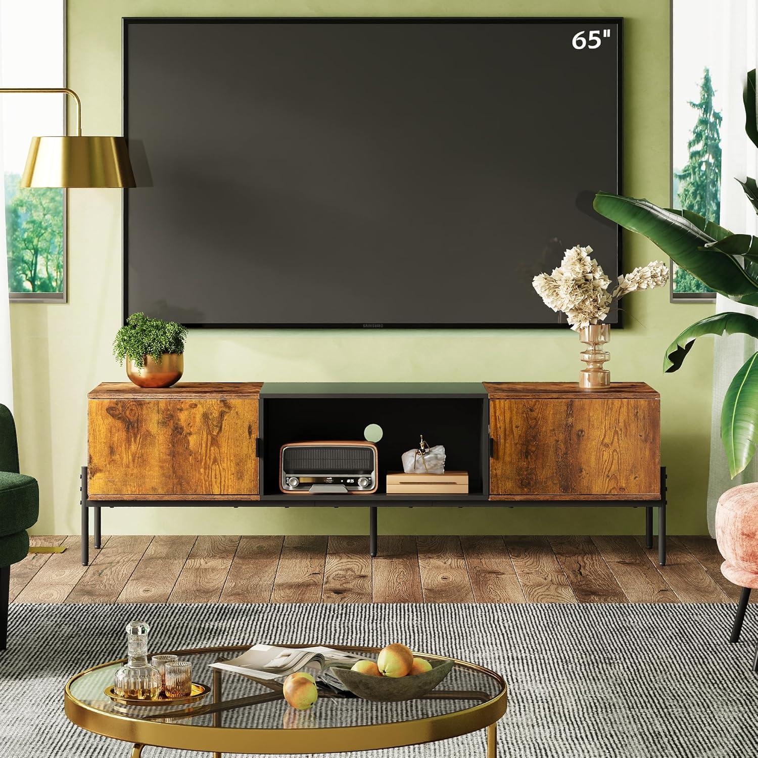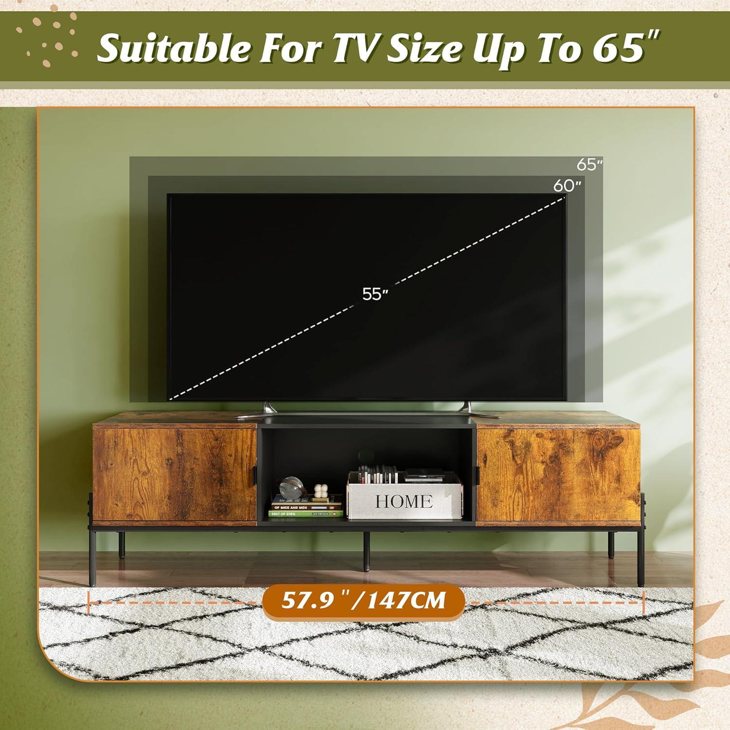 WLIVE Modern TV Stand for 65 Inch TV, Mid Century Entainment Center with Storage, TV Console with Open Shelf and 2 Cabinets for Bedroom and Living Room, TV Cabinet with Metal Legs, Black(Rustic Brown)