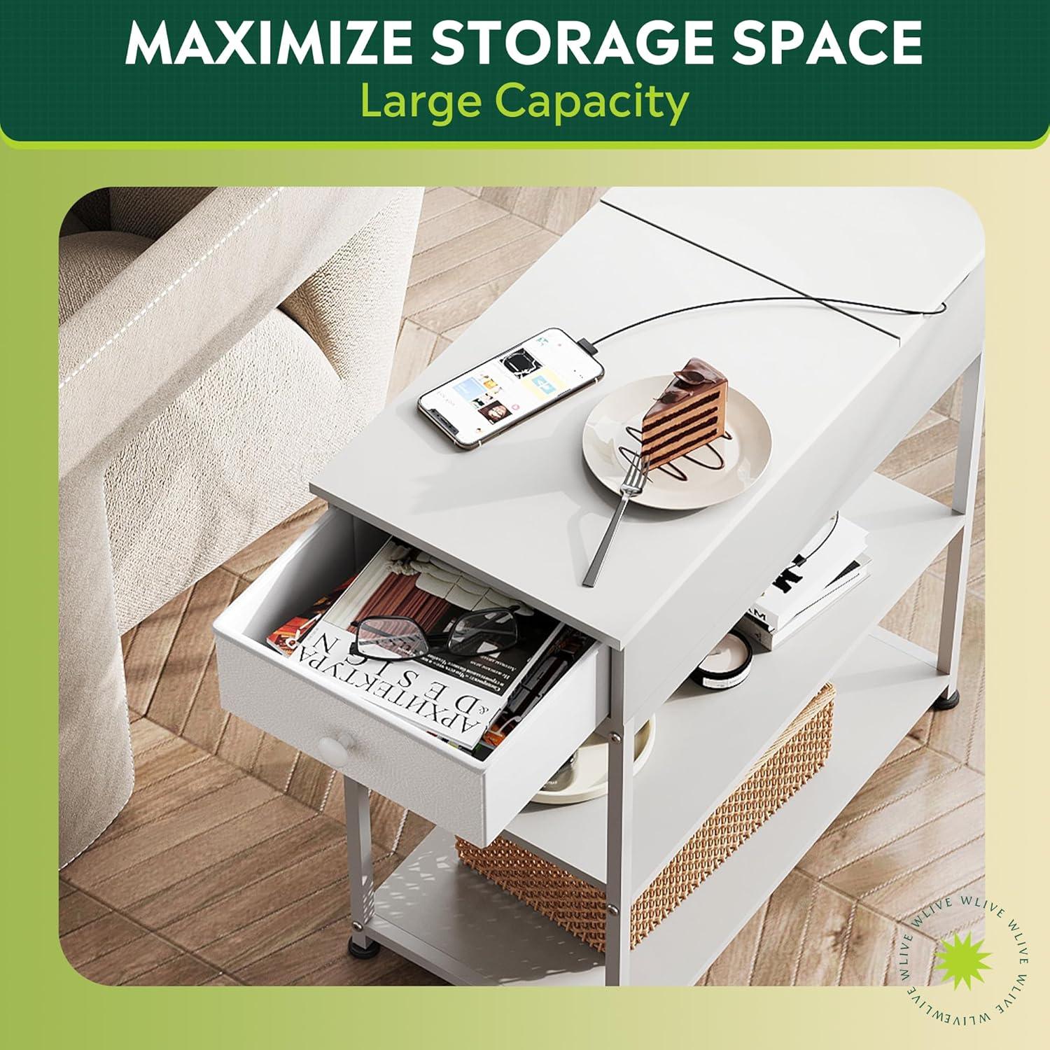imageWLIVE Narrow Side Table with Charging Station End Table for Living Room Couch Side Table with Fabric Drawer for Bedroon 118W 236L 24H Rustic BrownWhite