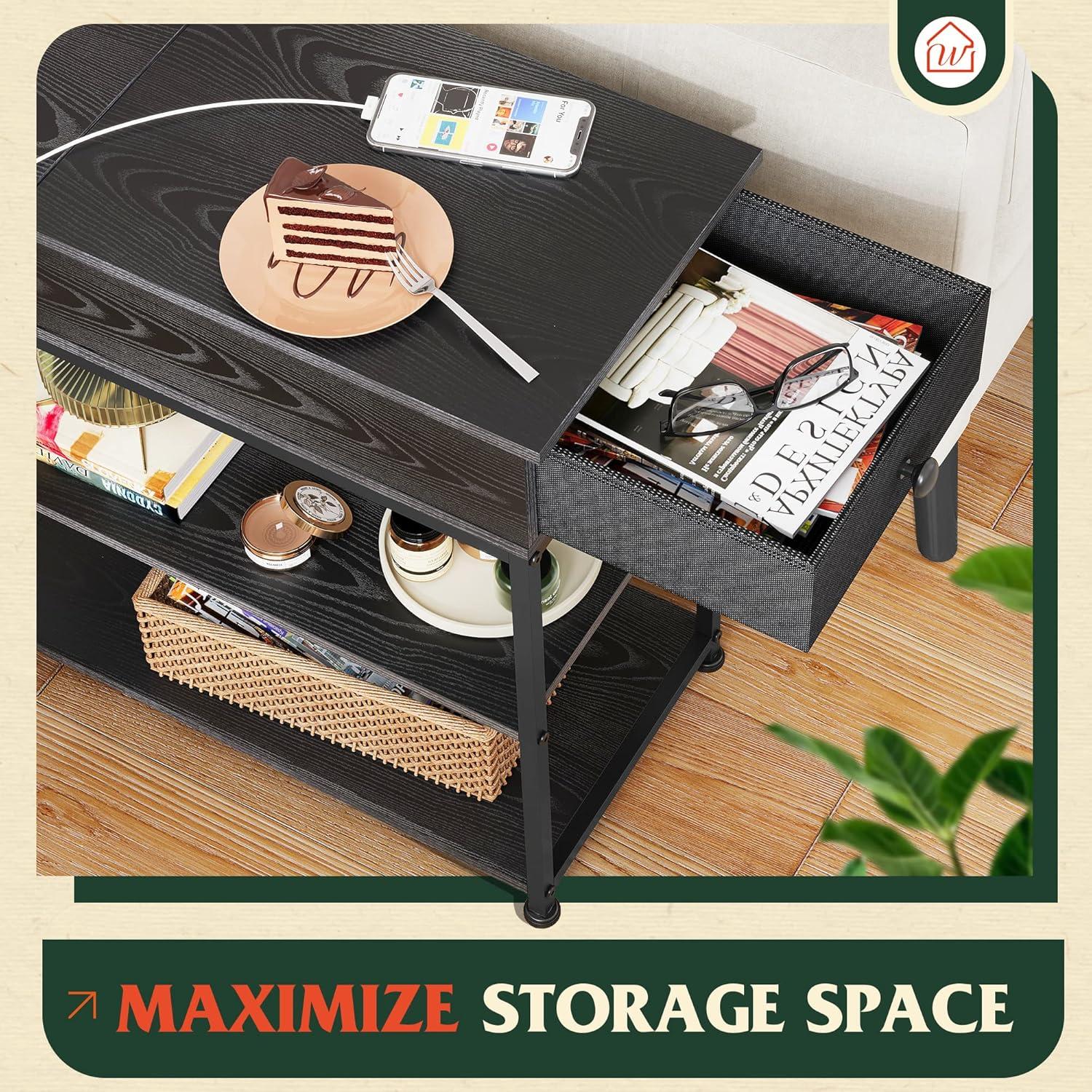 【Multifunctional Design】This small end table is made with high-quality metal and engineered Wood. For meeting your basic needs,it is also designed with 2 USB ports and outlets.The extra fabric drawer offers more storage spaces.