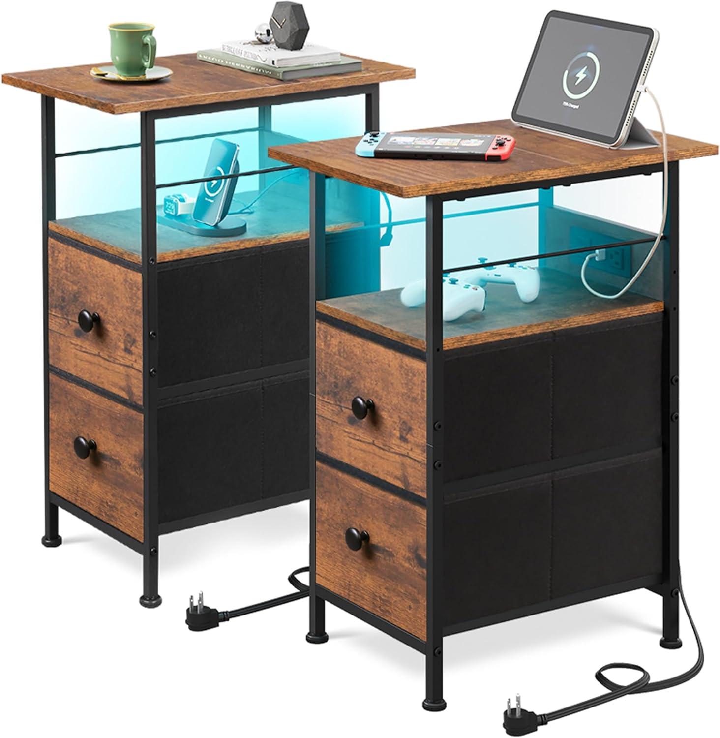WLIVE Narrow Side Table with Charging Station, End Table with LED Light, 2 Fabric Drawers and Open Shelf, Black Bedside Tables Living Room, Small Space, Bedroom, Night Stand with Charger Station(Rustic Brown With 3 Fabric Drawers)