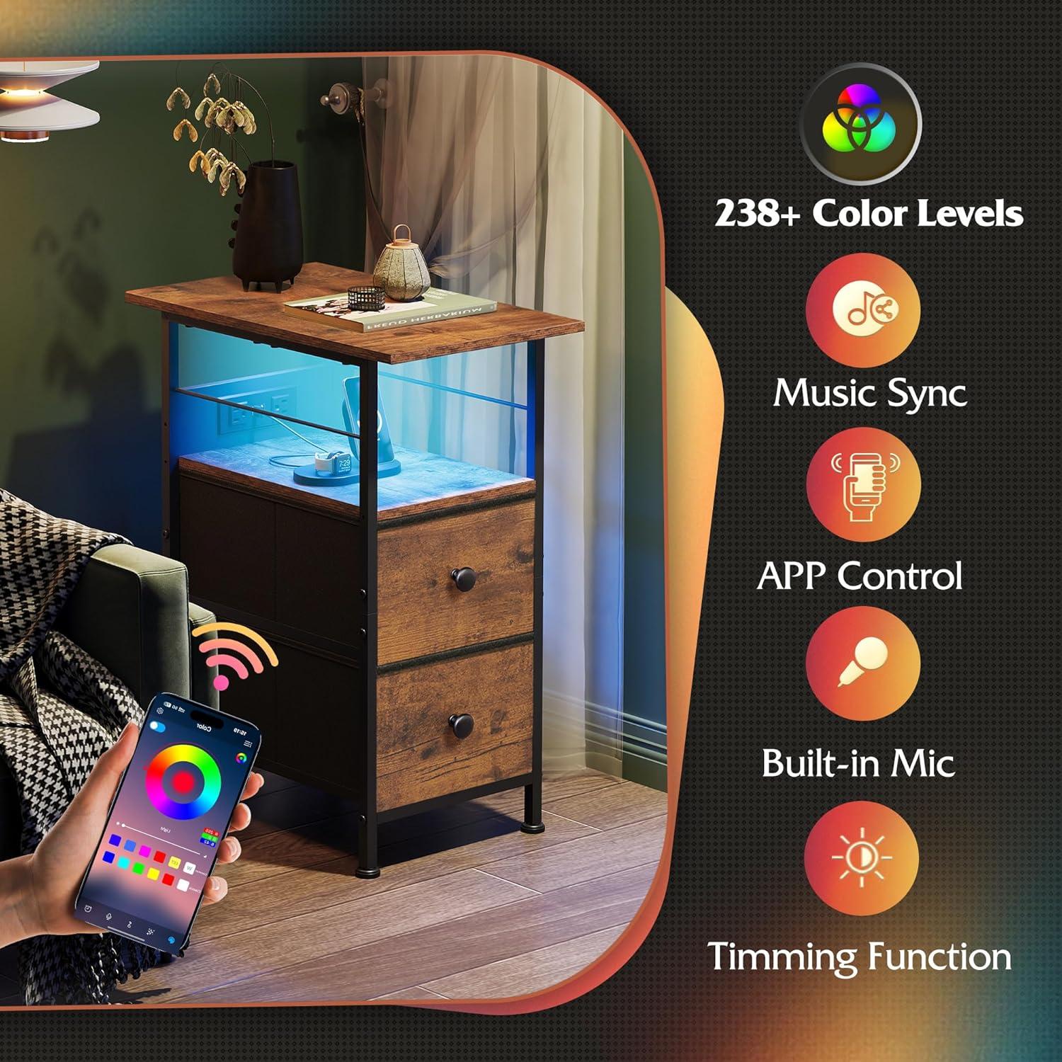 【Versatile Usage】This LED side table features 2 fabric drawers and 1 open shelf, which includes charger station. You can place this couch table beside your living room sofa, and it can also serve as a nightstand in the bedroom, effectively meeting your storage and power needs. Additionally, the LED light strip comes in various colors, creating a wonderful indoor atmosphere. This product also fits well with other home furniture.