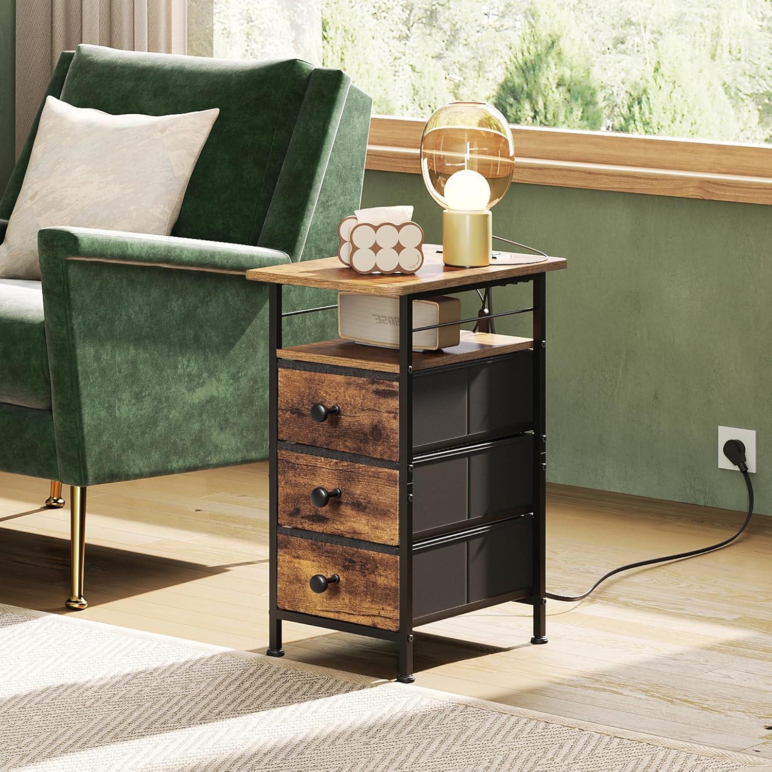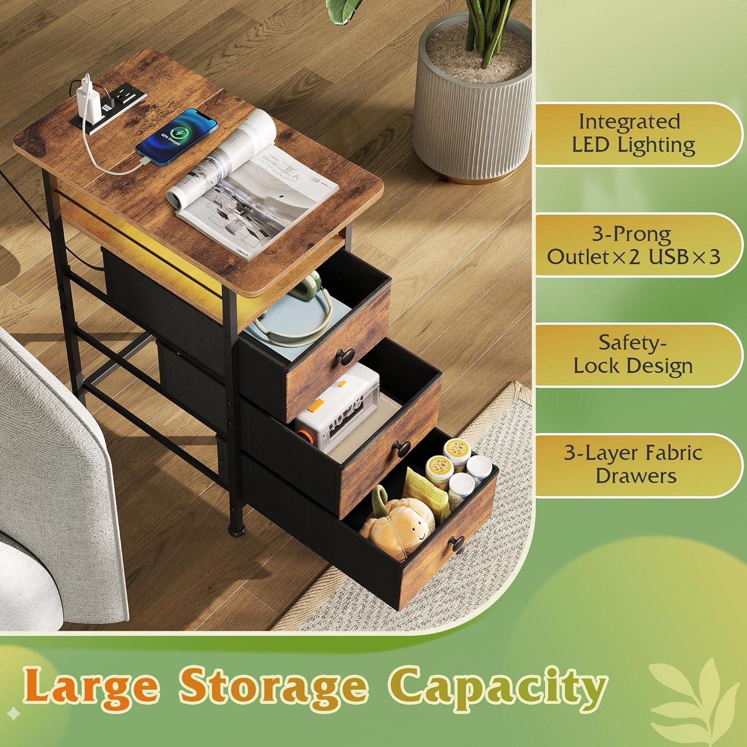 WLIVE Narrow Side Table with Charging Station, End Table with LED Light, 2 Fabric Drawers and Open Shelf, Black Bedside Tables Living Room, Small Space, Bedroom, Night Stand with Charger Station(Rustic Brown With 3 Fabric Drawers)