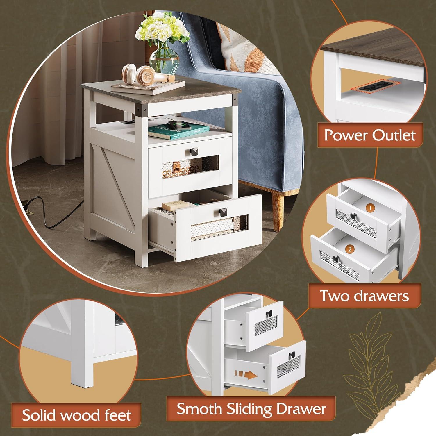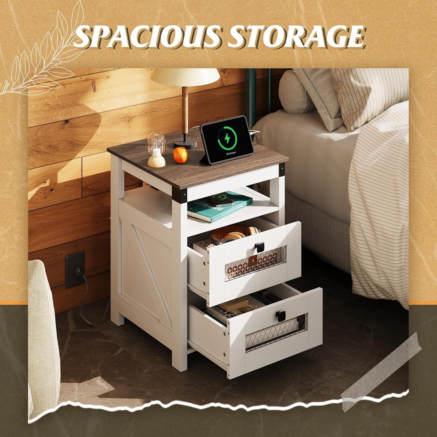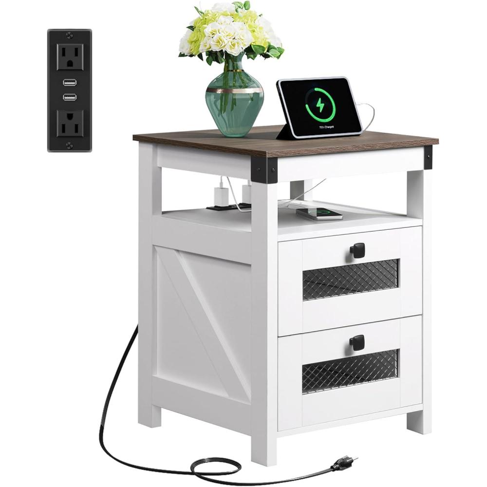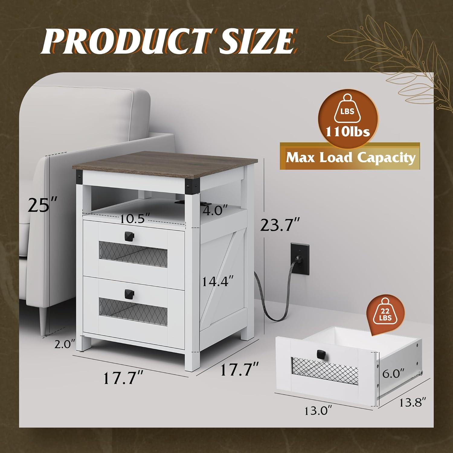 [Durable&Stable]: This wooden 2-drawer end table with charging station with smooth metal glides is made of a mixture of particleboard and frame, which has excellent durability and stability. This farmhouse bedside table can be used for a long time, unnecessary for replacement. The capacity can reach up to 22 lbs, meeting your daily basic needs