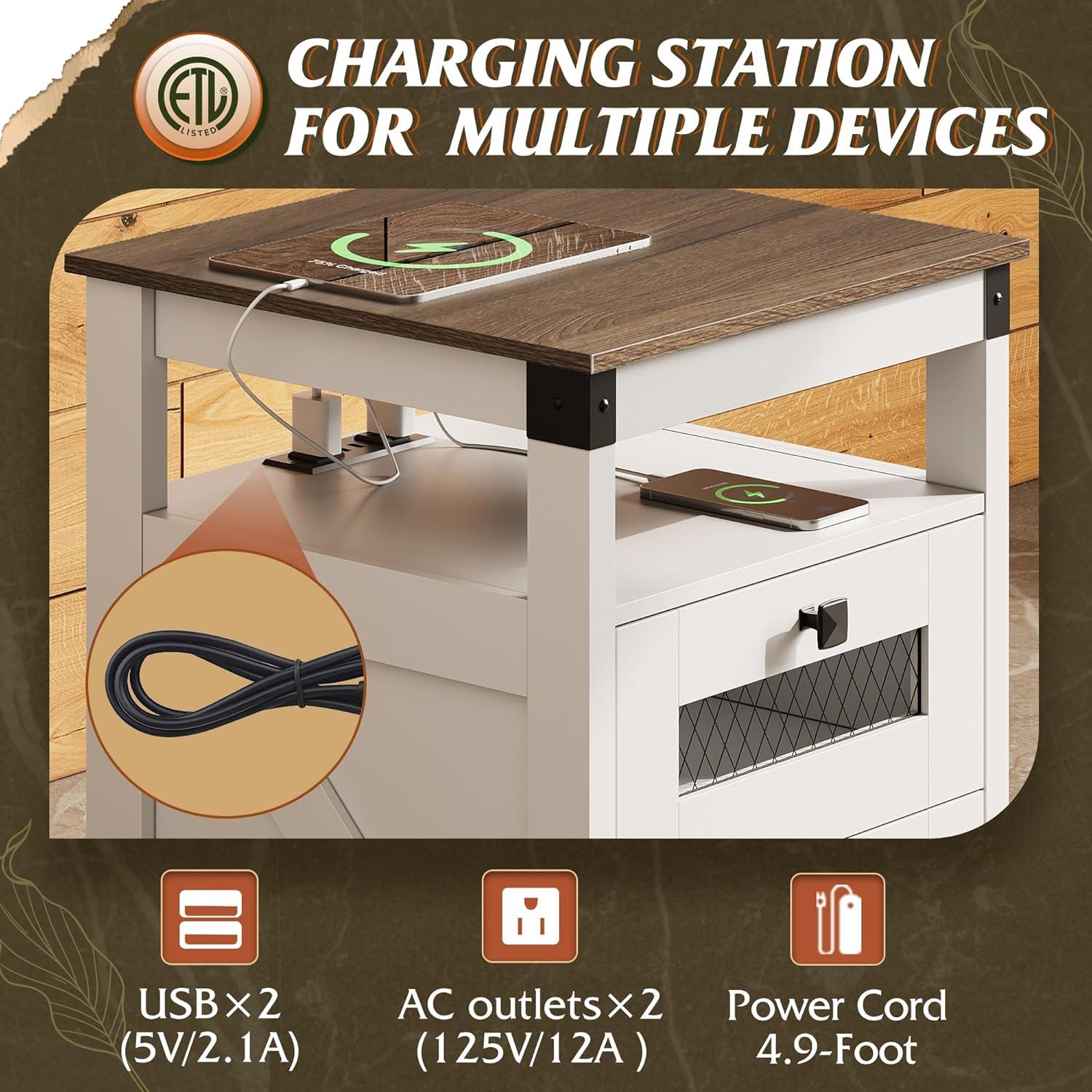 [Charging Station]The small side table with storage is equipped with 2 USB ports and AC outlets, making it convenient to charge various electronic devices at the same time, so you no longer have to worry about finding an available charging port. The living room tables' built-in power design also effectively prevents issues caused by spills, ensuring safety during everyday use.