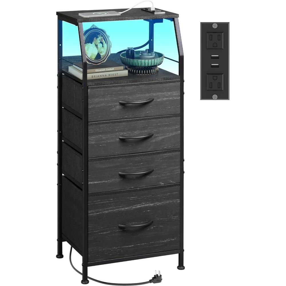 imageWLIVE Night Stand with Charger Station White Nightstand with LED Light and 4 Storage Drawers Tall Dresser for Bedroom 3748quot H Bedside Table with Fabric Bins Wood ShelfBlack