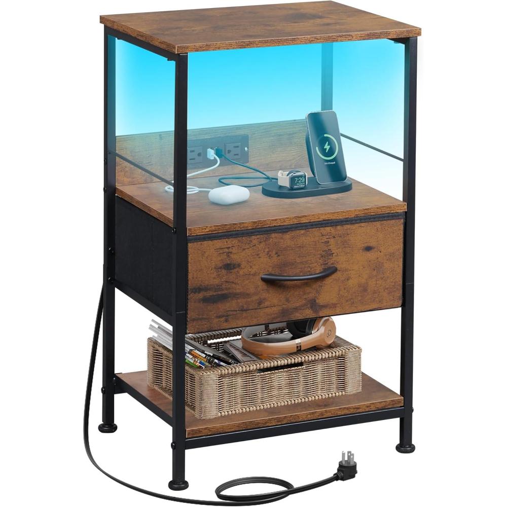 SPACIOUS STORAGE SPACE: While the end table is cute, it suprisingly has room for a lot. The bedside table has 1 drawer for hidden storage and 2 spaces for open storage. The fabric bin is perfect for private things and the top and the open shelf for lamp,clock, books, etc.