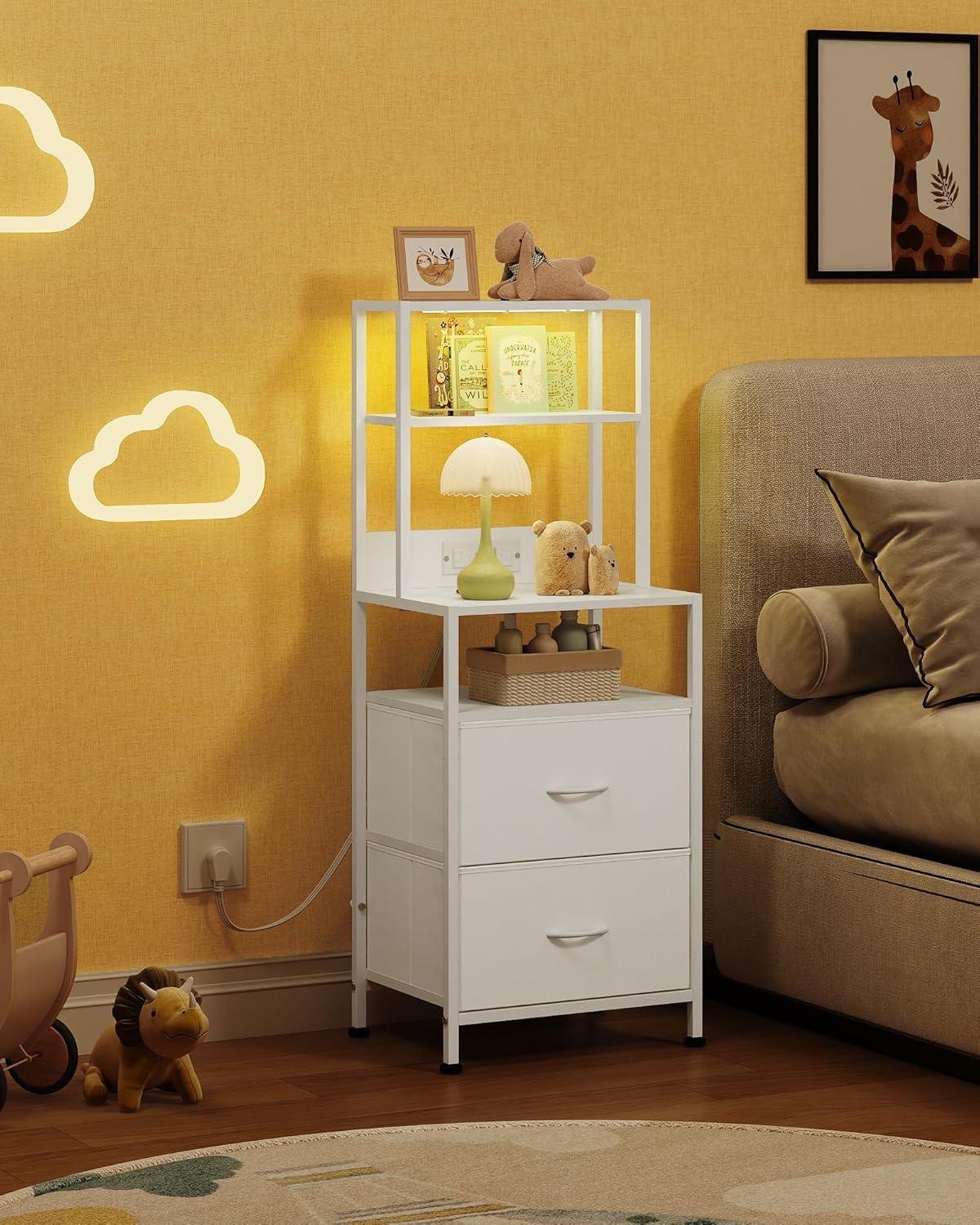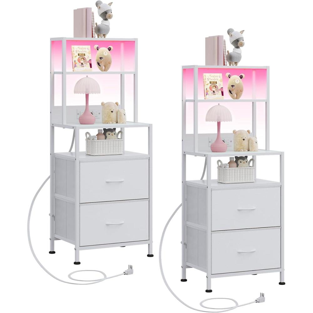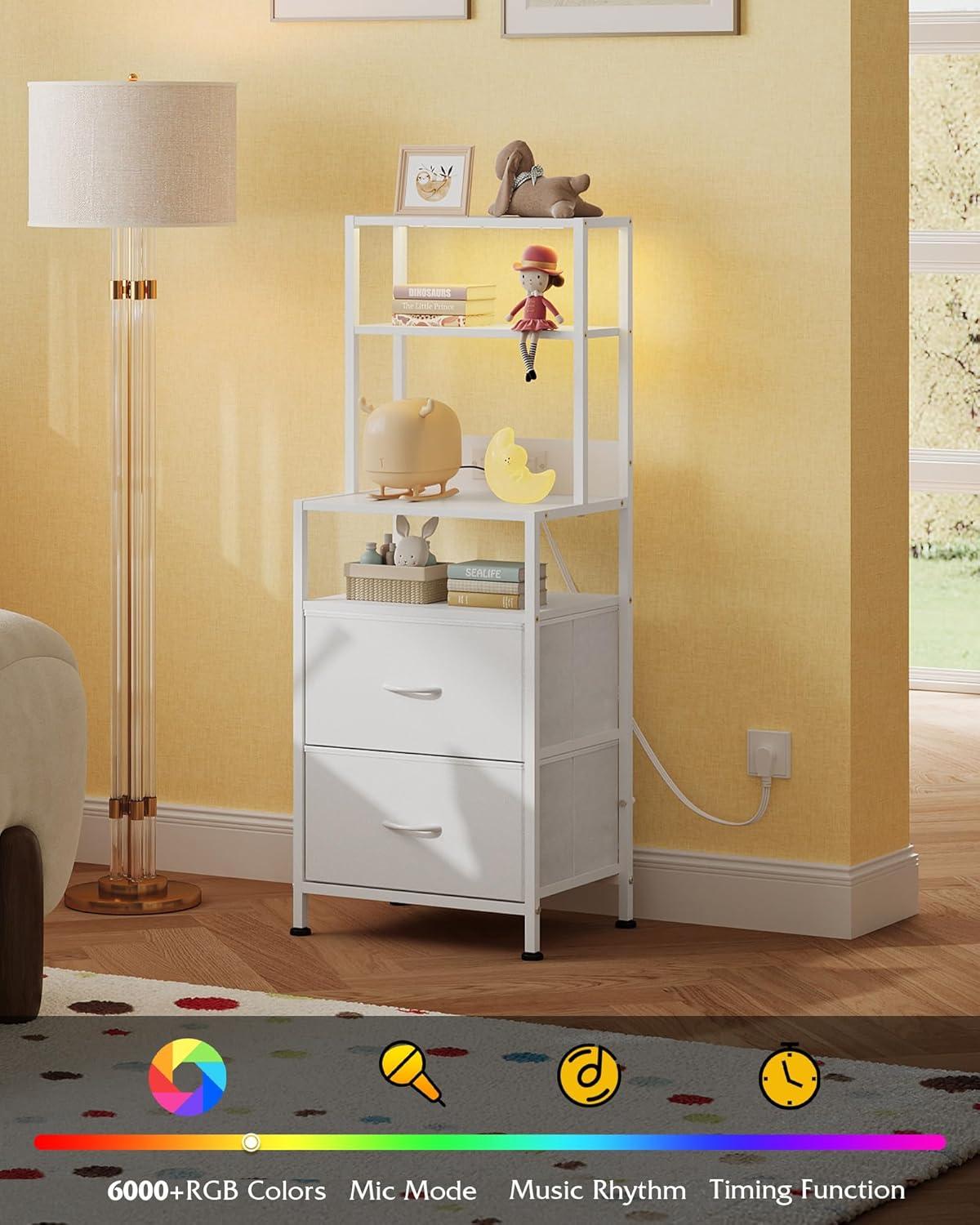 WLIVE Nightstand Set of 2 with Charging Station, LED Night Stand Sets with 2 Drawers and 4 Storage Open Shelves, Fabric Dressers for Bedroom, Black(White)