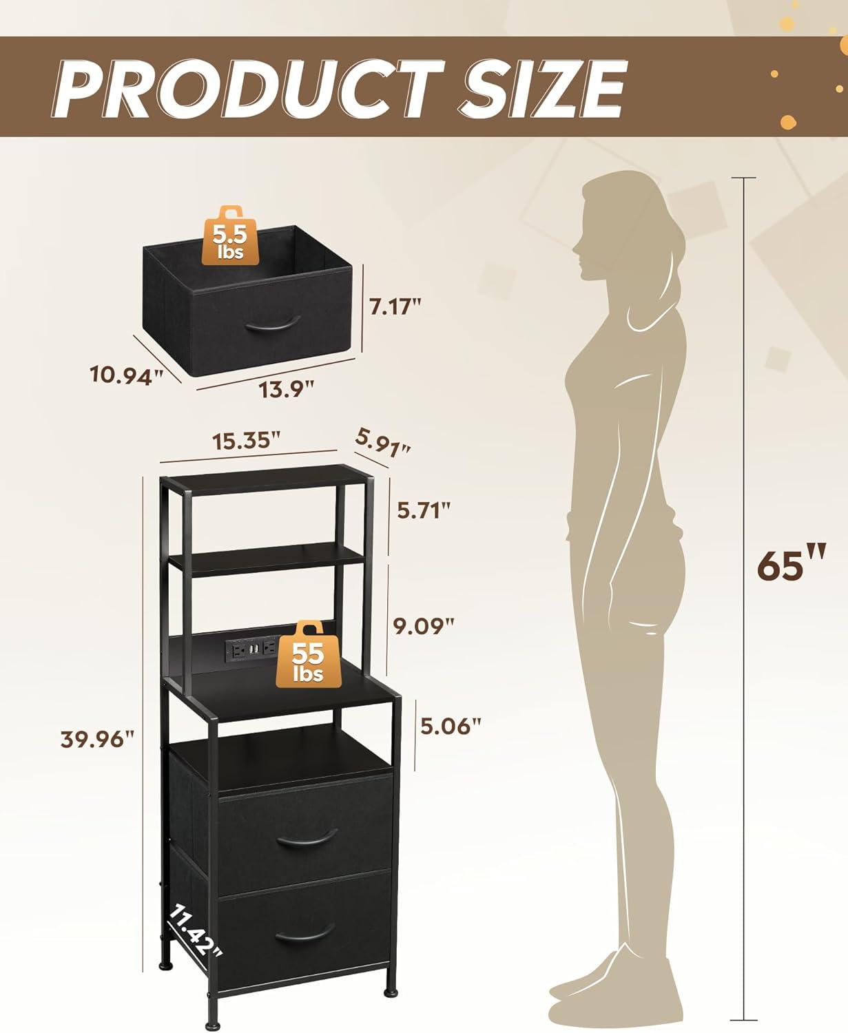 [4-Tier Storage Cabinet] This bedside table offers 2 fabric drawers for private storage and 4 open shelves for displaying lamps, books, or remotes. A versatile storage organizer for bedroom, living room, or office.