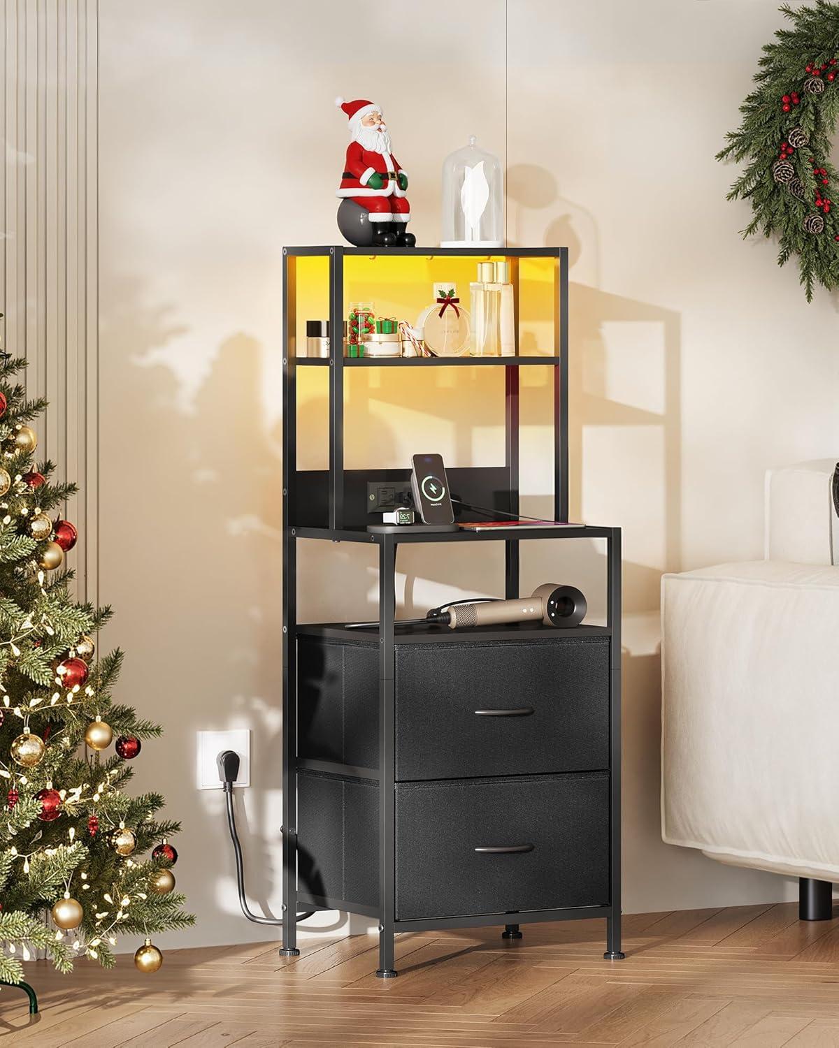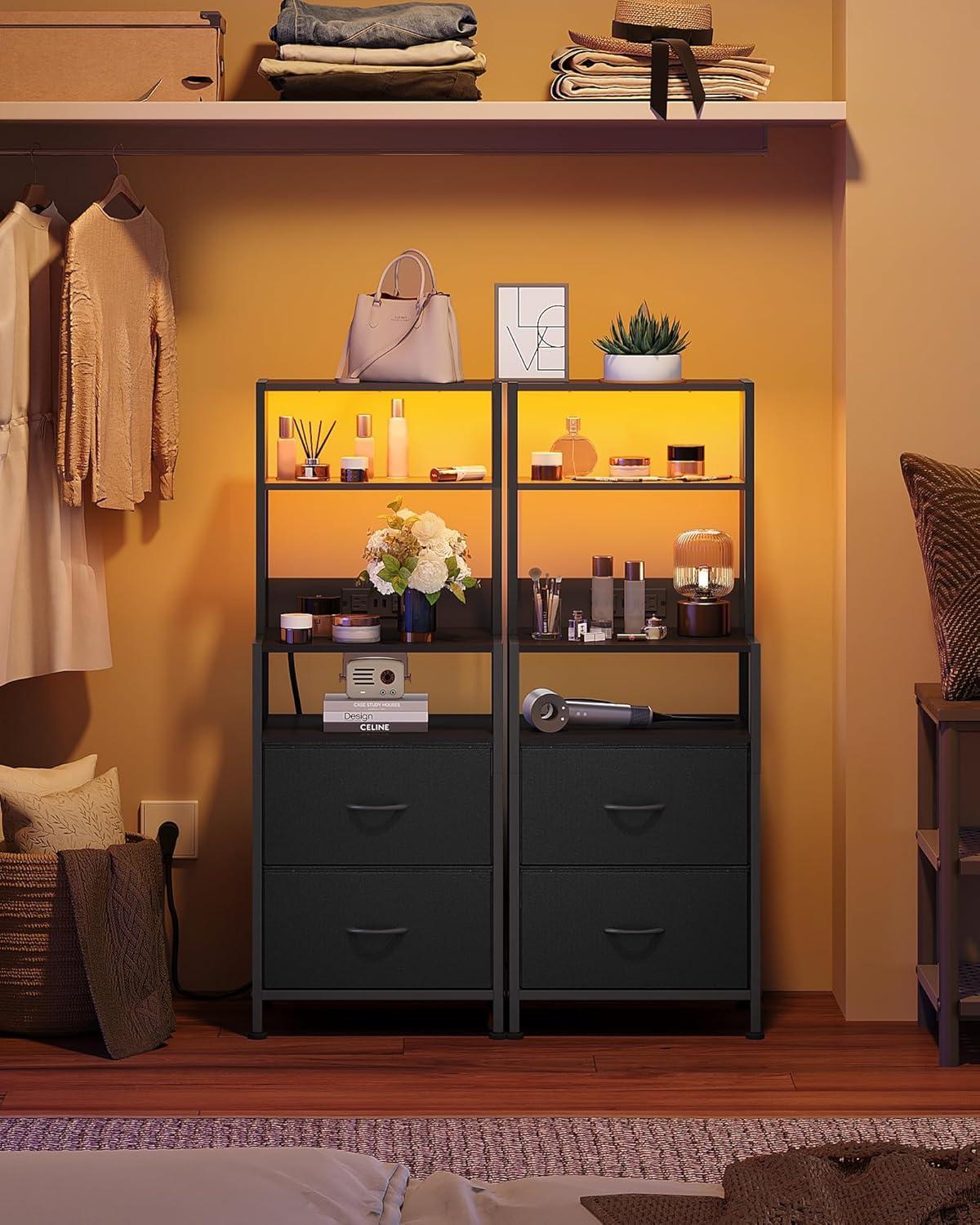 WLIVE Nightstand with Charging Station, LED Night Stand with 2 Fabric Drawers and 4 Storage Open Shelves, Bedside End Table for Bedroom, White(Black)