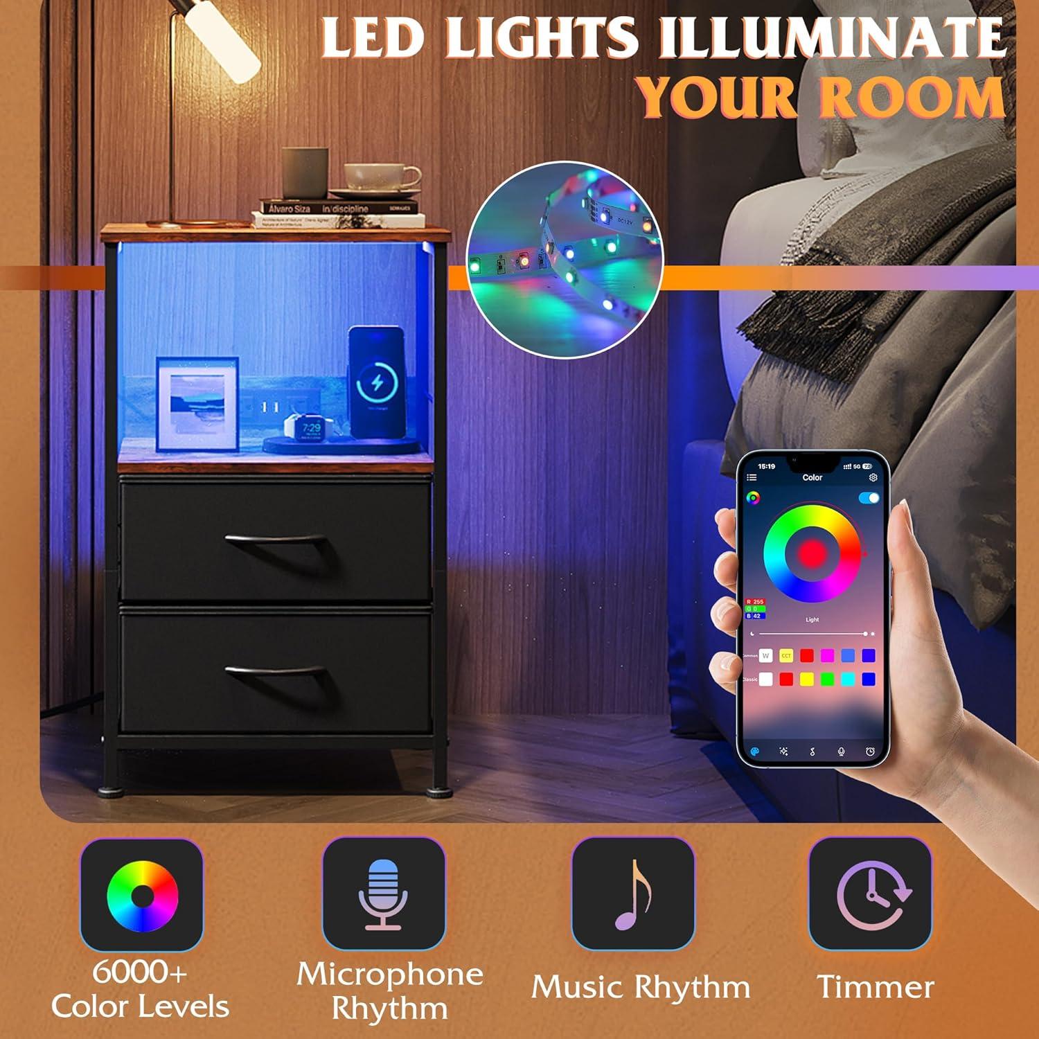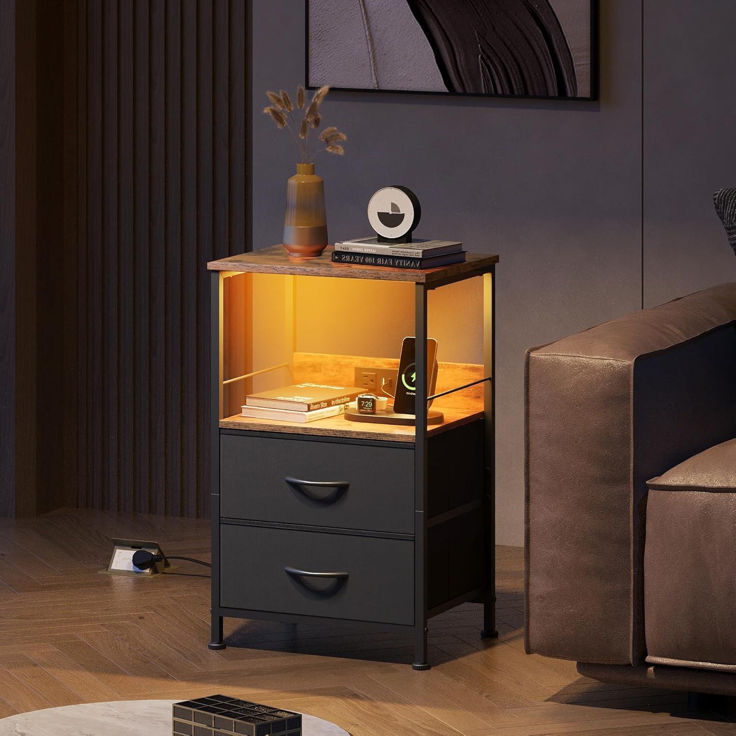 WLIVE Nightstand with Charging Station, LED Night Stand with 2 Fabric Drawers and Open Shelf, Small Dresser for Small Spaces, Side End Tables for Bedroom, Rustic Brown and Black(Black and Rustic Brown)