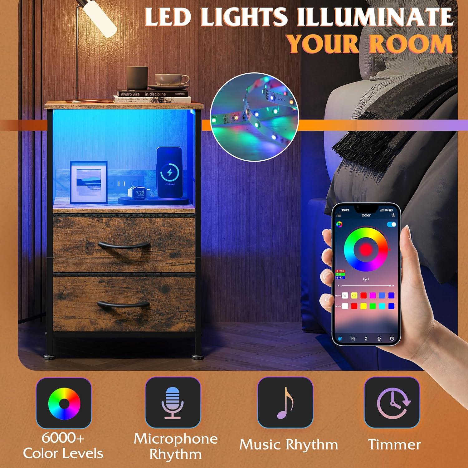 WLIVE Nightstand with Charging Station, LED Night Stand with 2 Fabric Drawers and Open Shelf, Small Dresser for Small Spaces, Side End Tables for Bedroom, Rustic Brown and Black(White)
