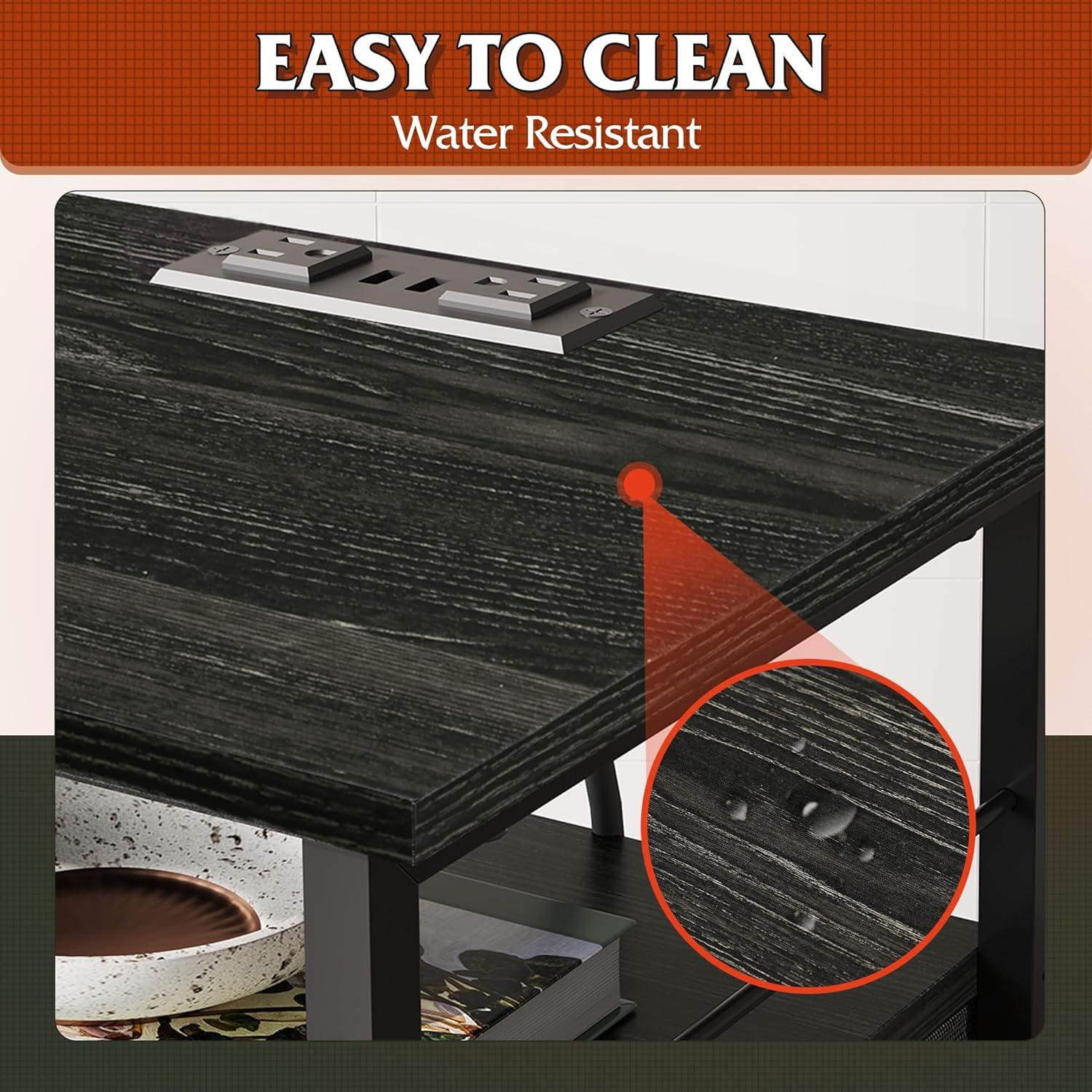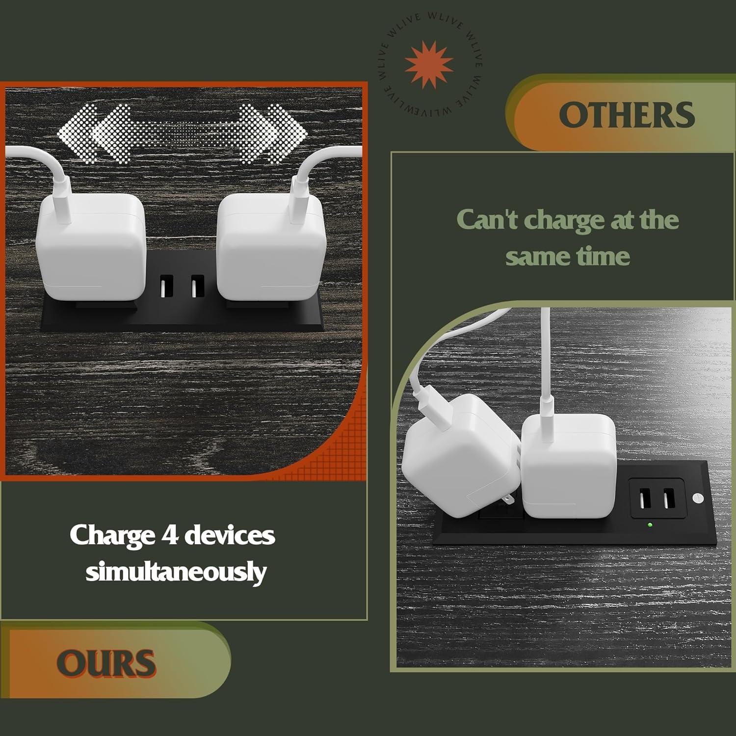 [Nightstand with Charging Station]: No electricity? Don't worry. This end table comes with 2 standard plug outlets and 2 USB ports for most electronics. The layout of outlests is just right to avoid chargers‘ mutual interference and meet your needs for charging 4 devices at the same time.