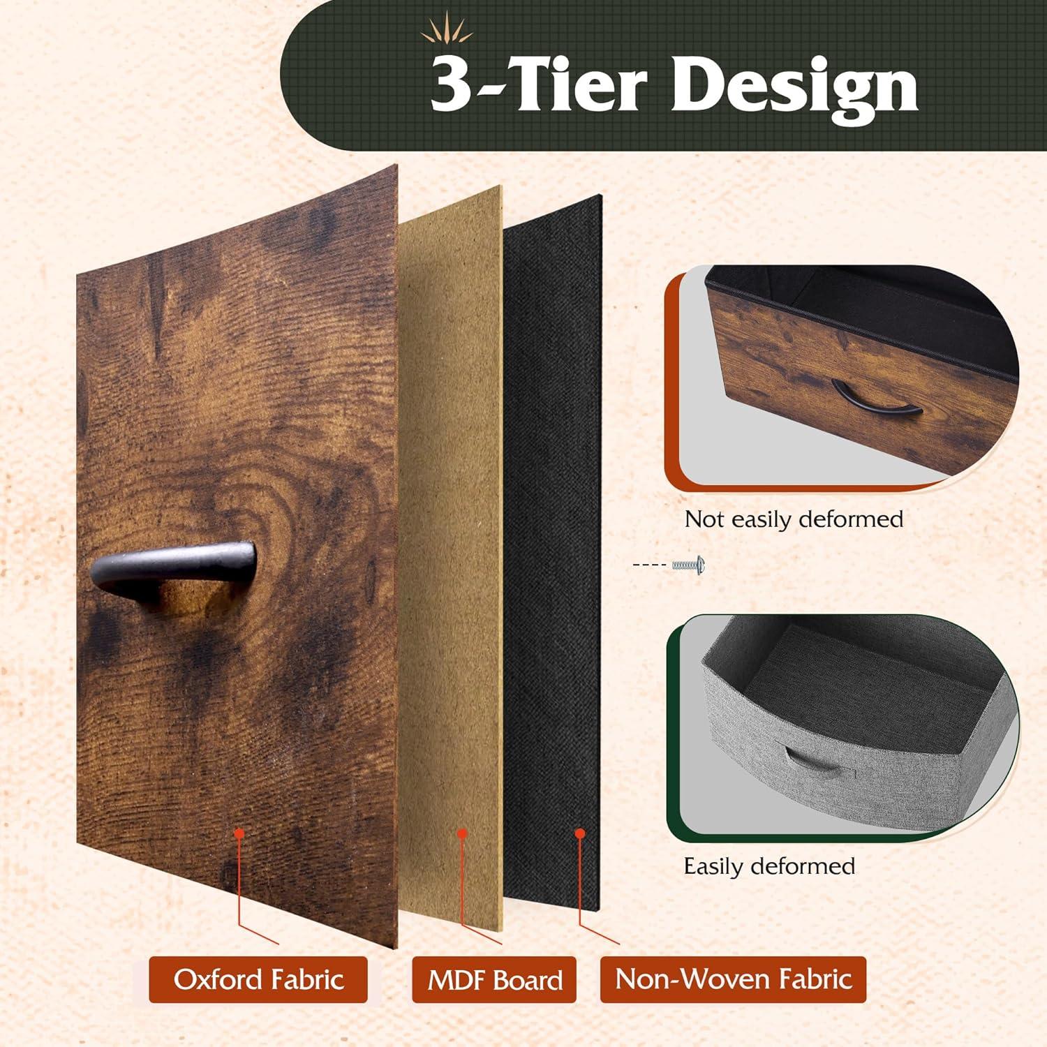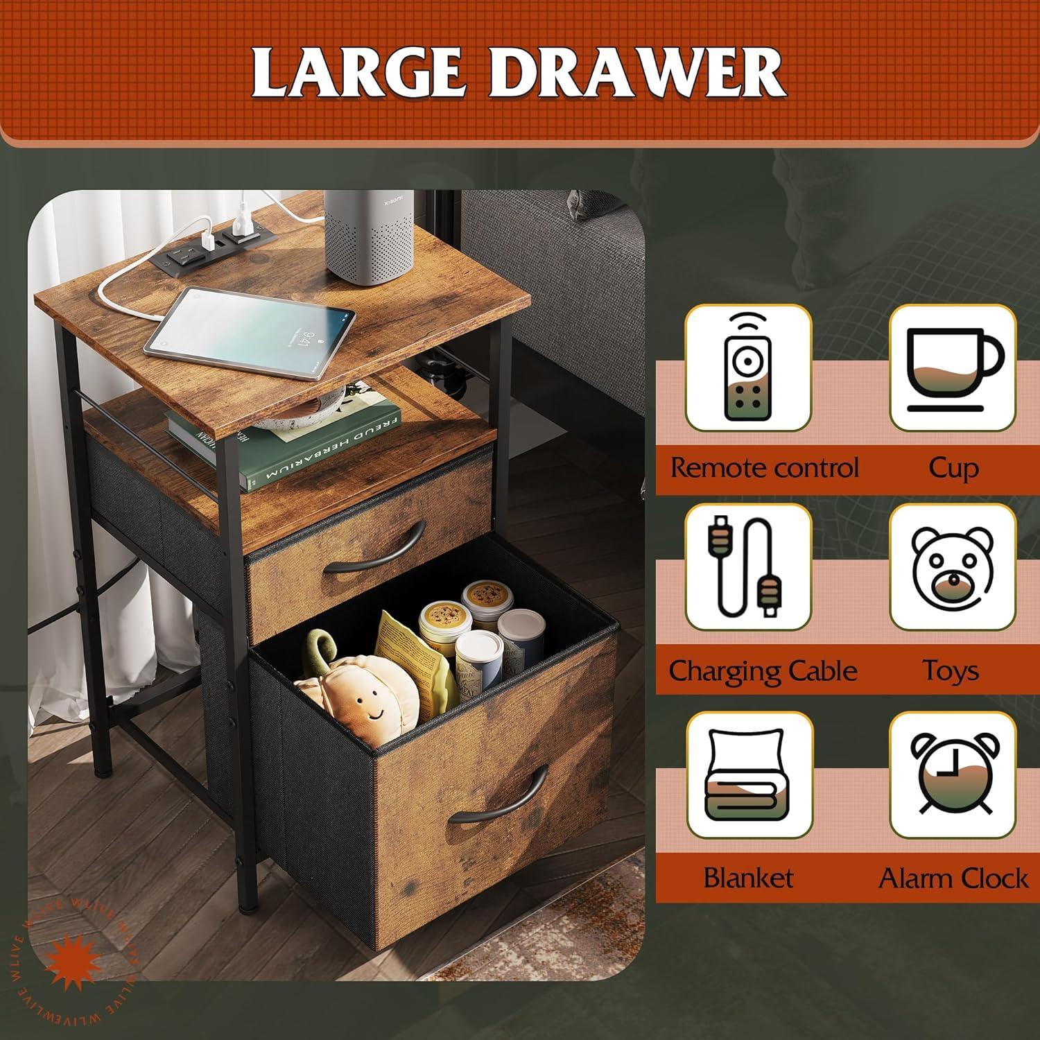 WLIVE Nightstand with Charging Station, Side Table with 2 Fabric Drawers, End Tables for Bedroom, Small Dresser, USB Ports and Outlets, Charcoal Black(Rustic Brown)