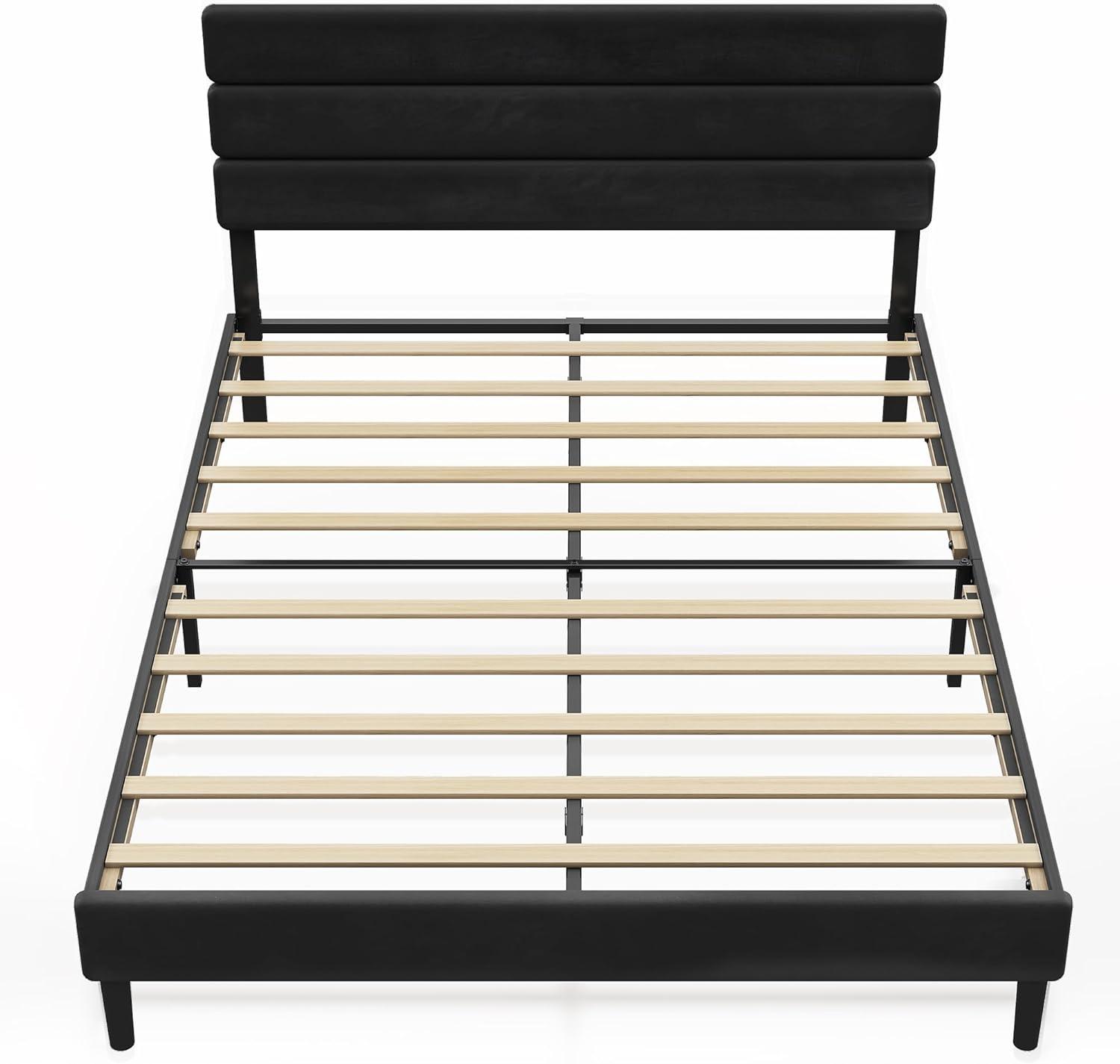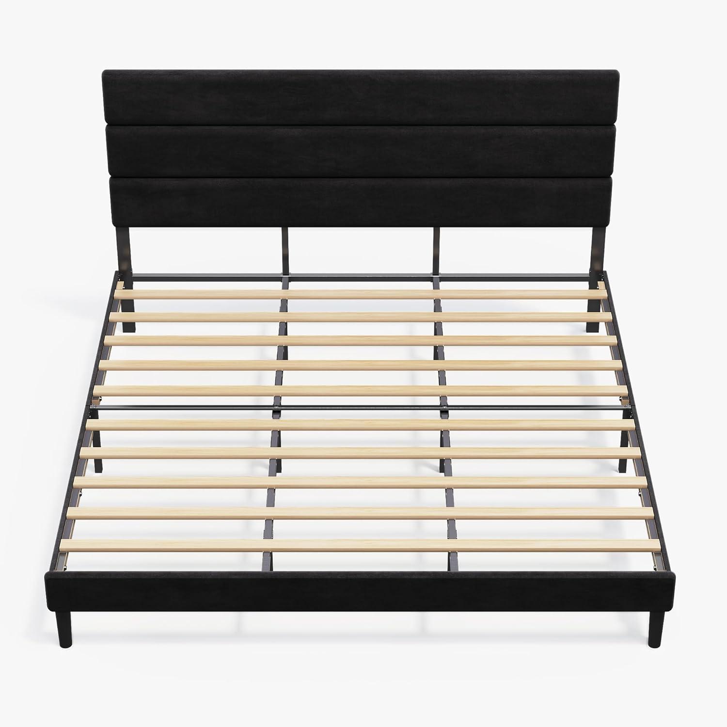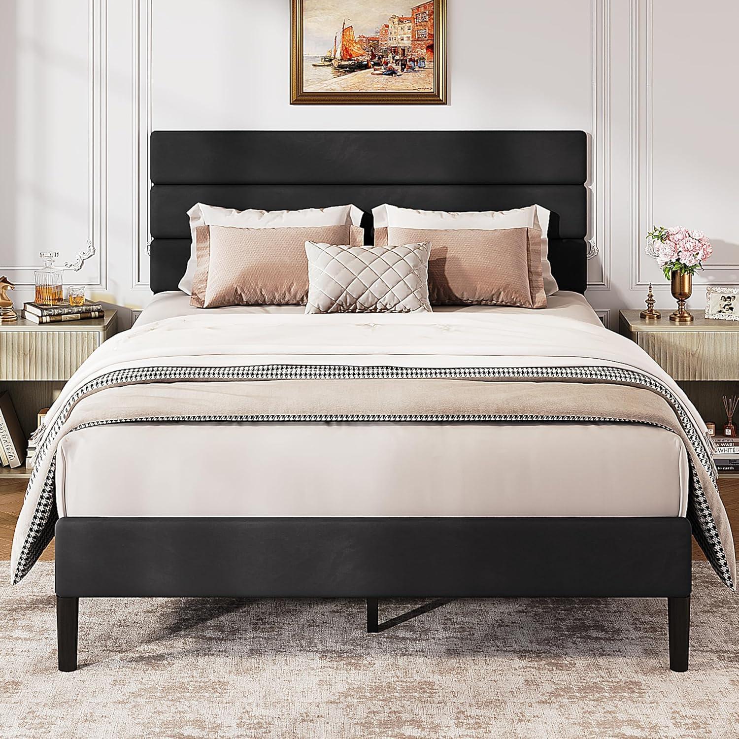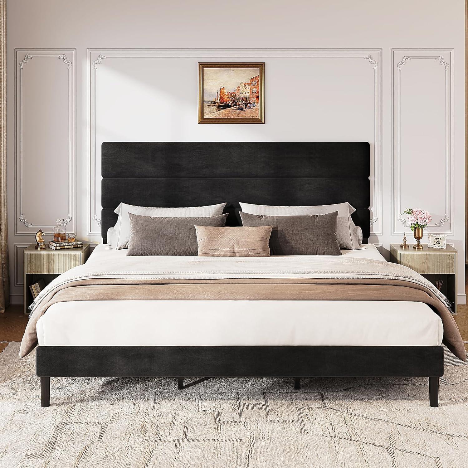 WLIVE Queen Size Upholstered Bed Frame, Velvet Square Tufted Headboard, Sturdy Metal & Wooden Slats Support, No Box Spring Needed, Light Grey(Black)