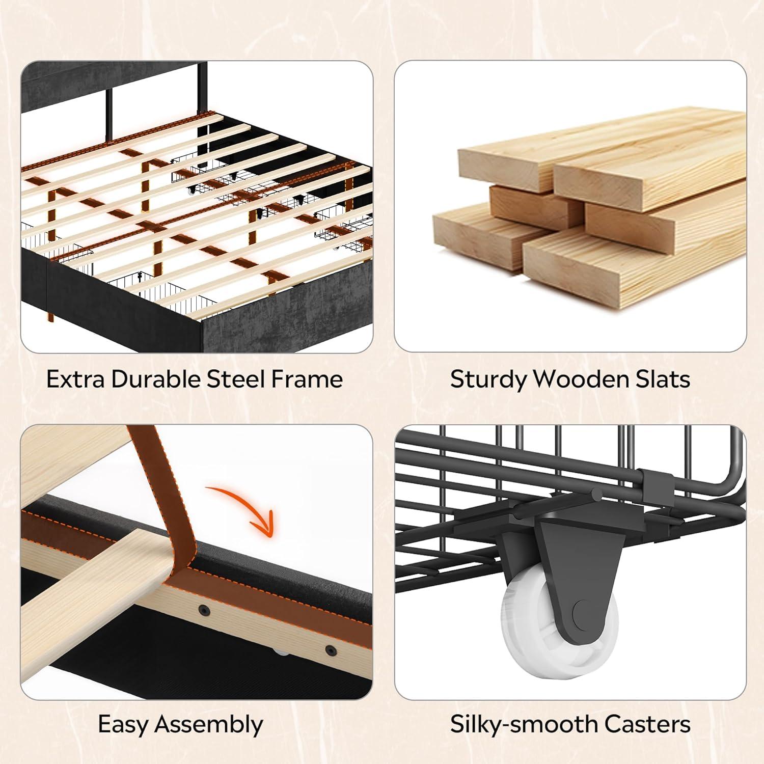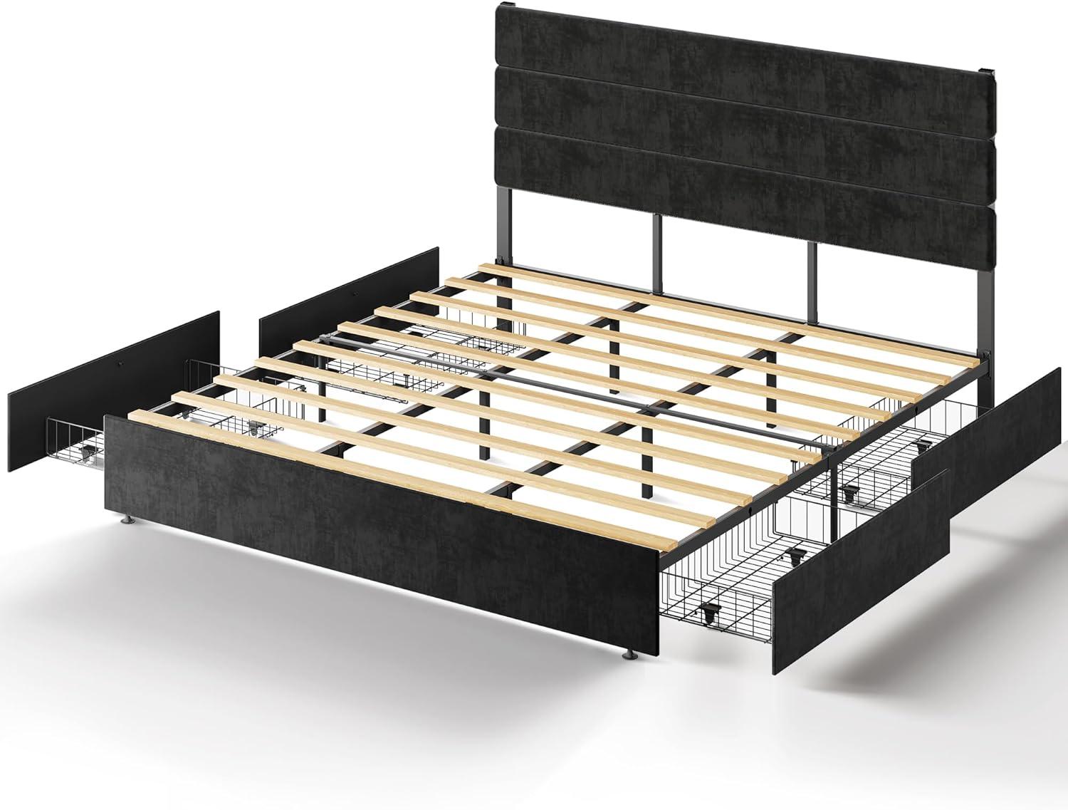 WLIVE Queen Size Upholstered Bed Frame with 4 Drawers and Velvet Square Tufted Headboard, Sturdy Metal & Wooden Slats Support, No Box Spring Needed, Easy Assembly, Light Grey(Black)