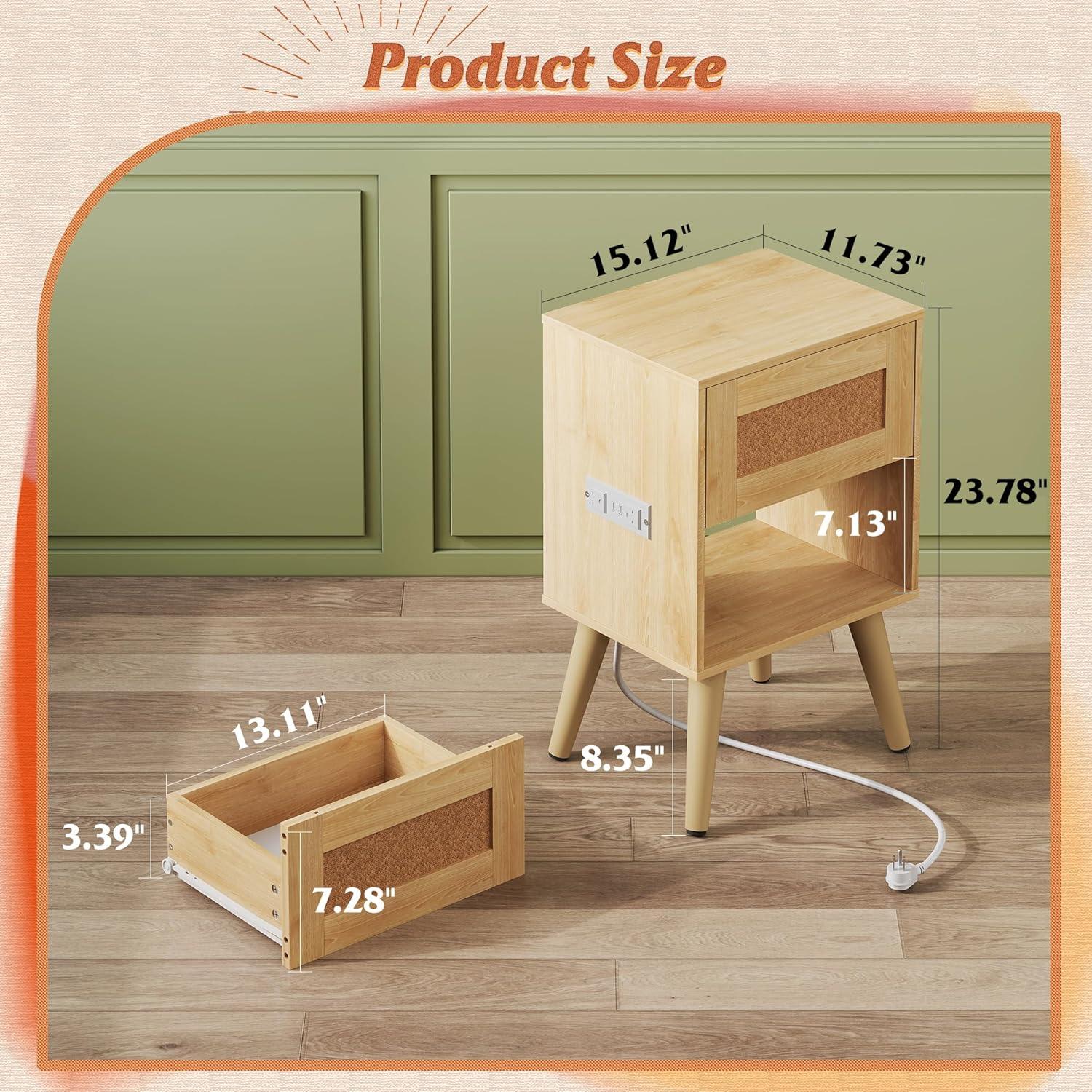 WLIVE Rattan Nightstands Set of 2, Night Stand Sets with Charging Station, Boho Bed Side Table with Storage Drawer and Open Shelf, End Tables Bedroom, Natural Oak(Natural)