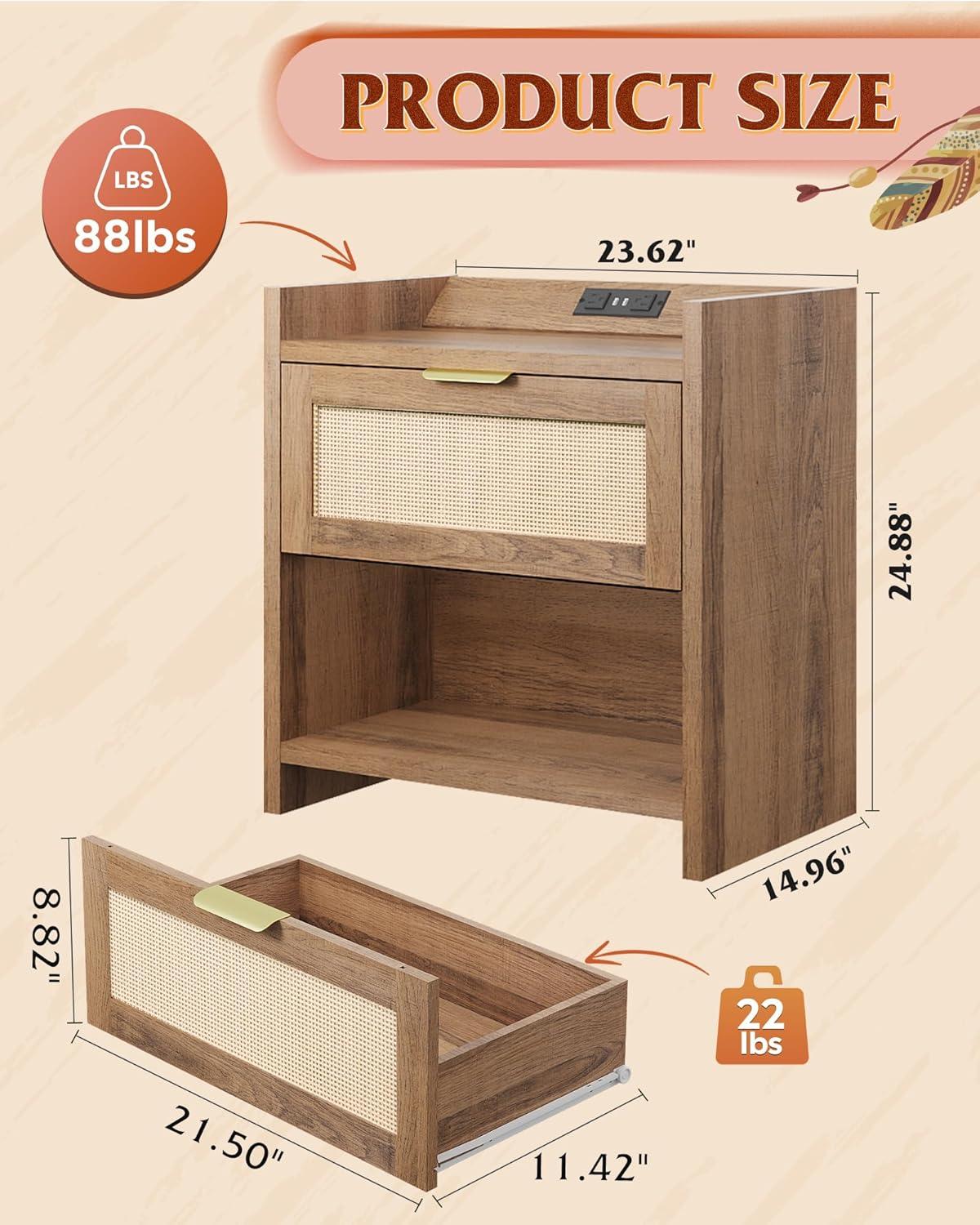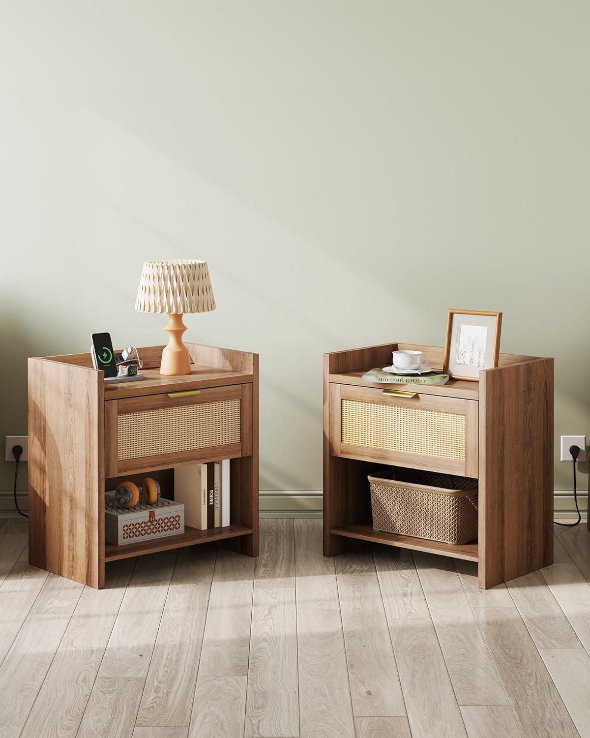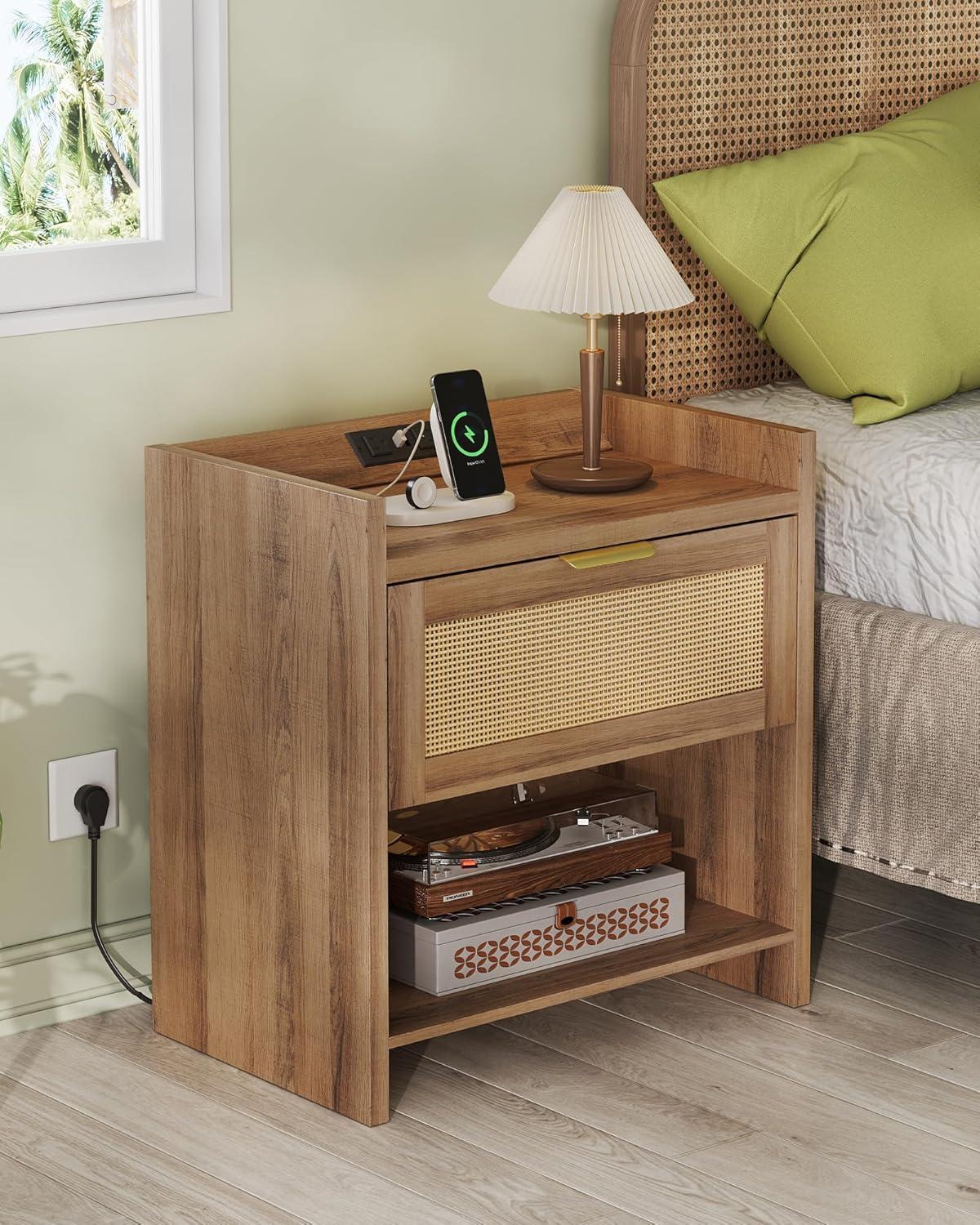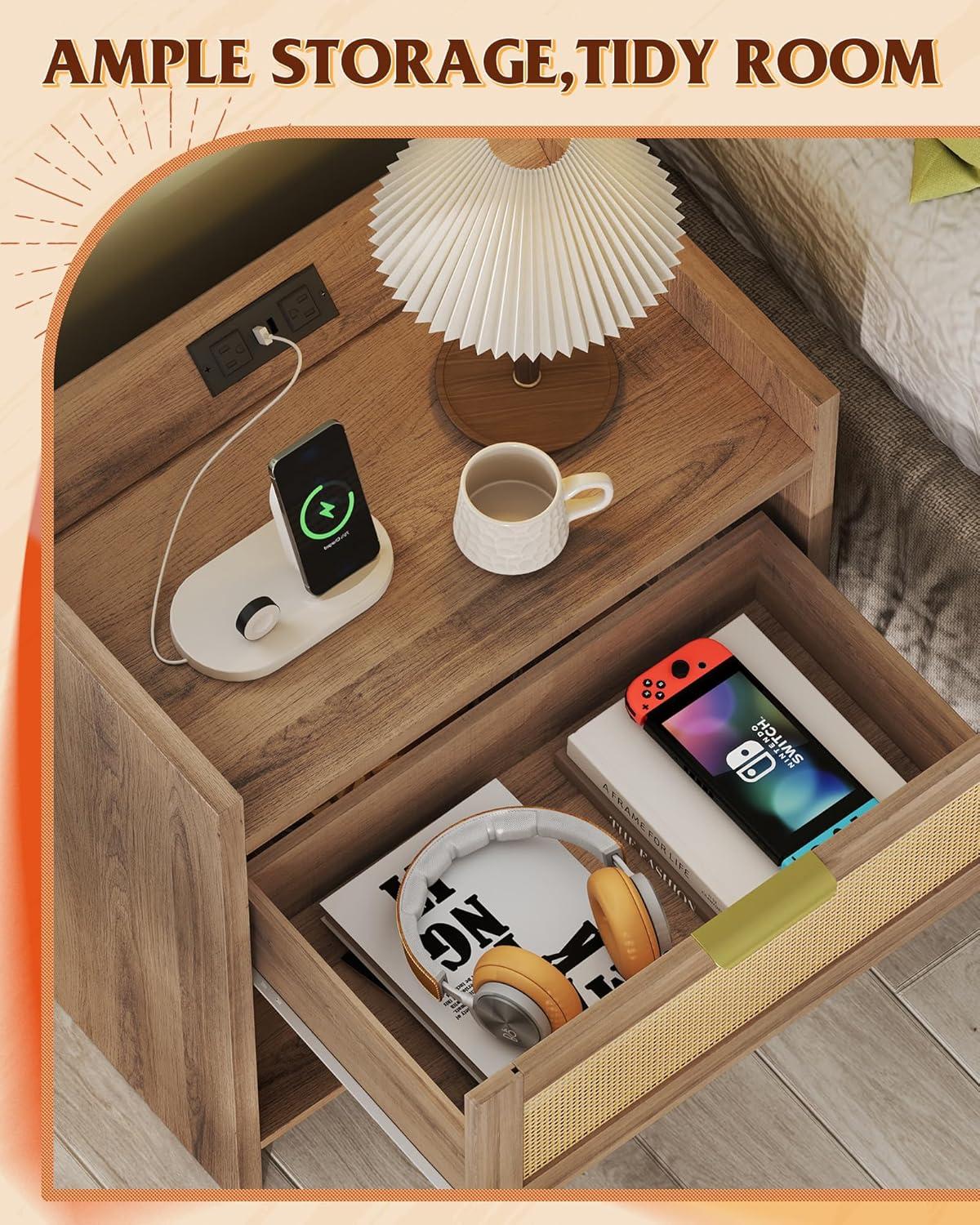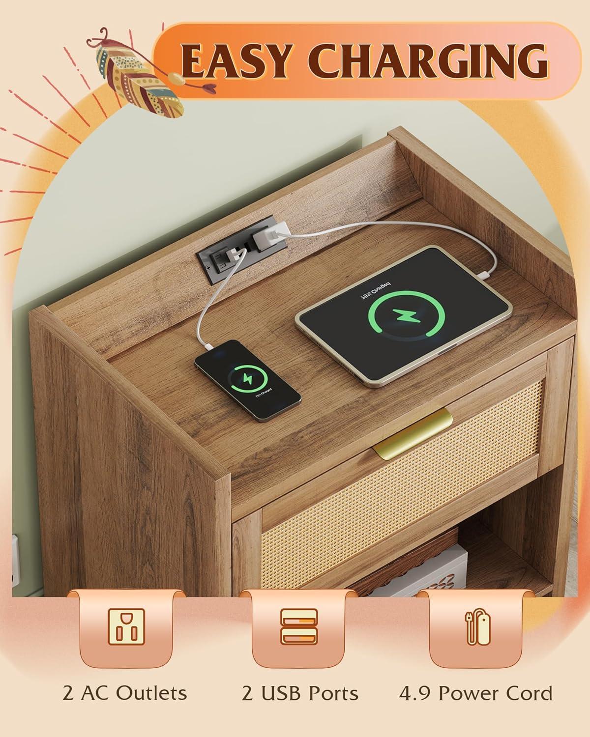 【Smart Charging Nightstand】This wooden nightstand doubles as a charging station, featuring 2 USB + 2 AC outlets on a splash-proof top panel. Perfect for your bedside table or living room side table, it keeps phones, tablets, and watches powered up without worrying about spills.