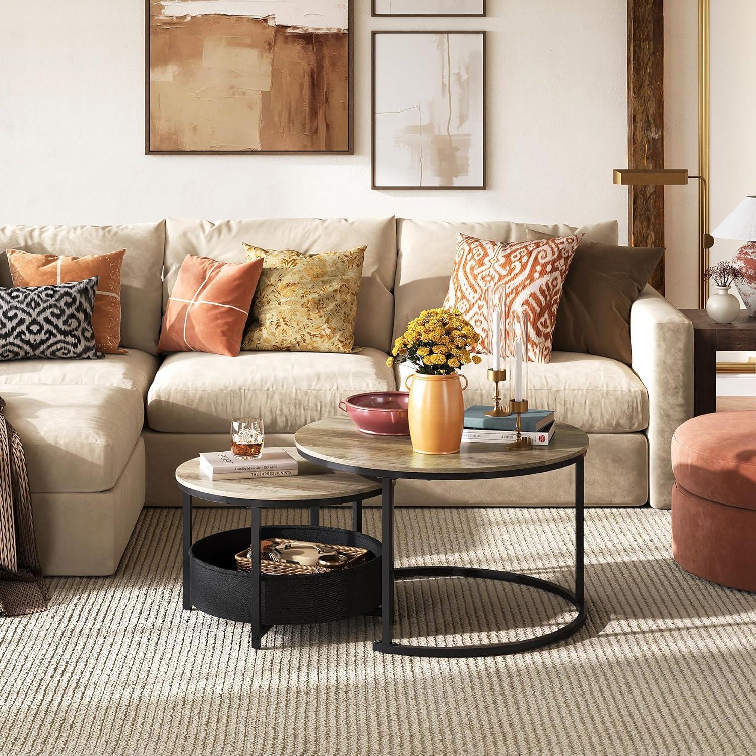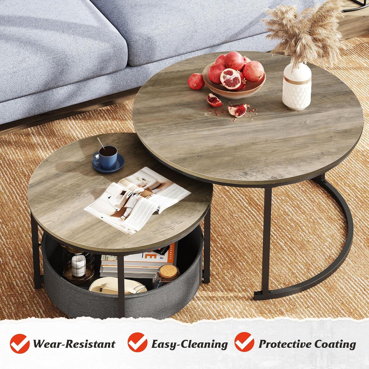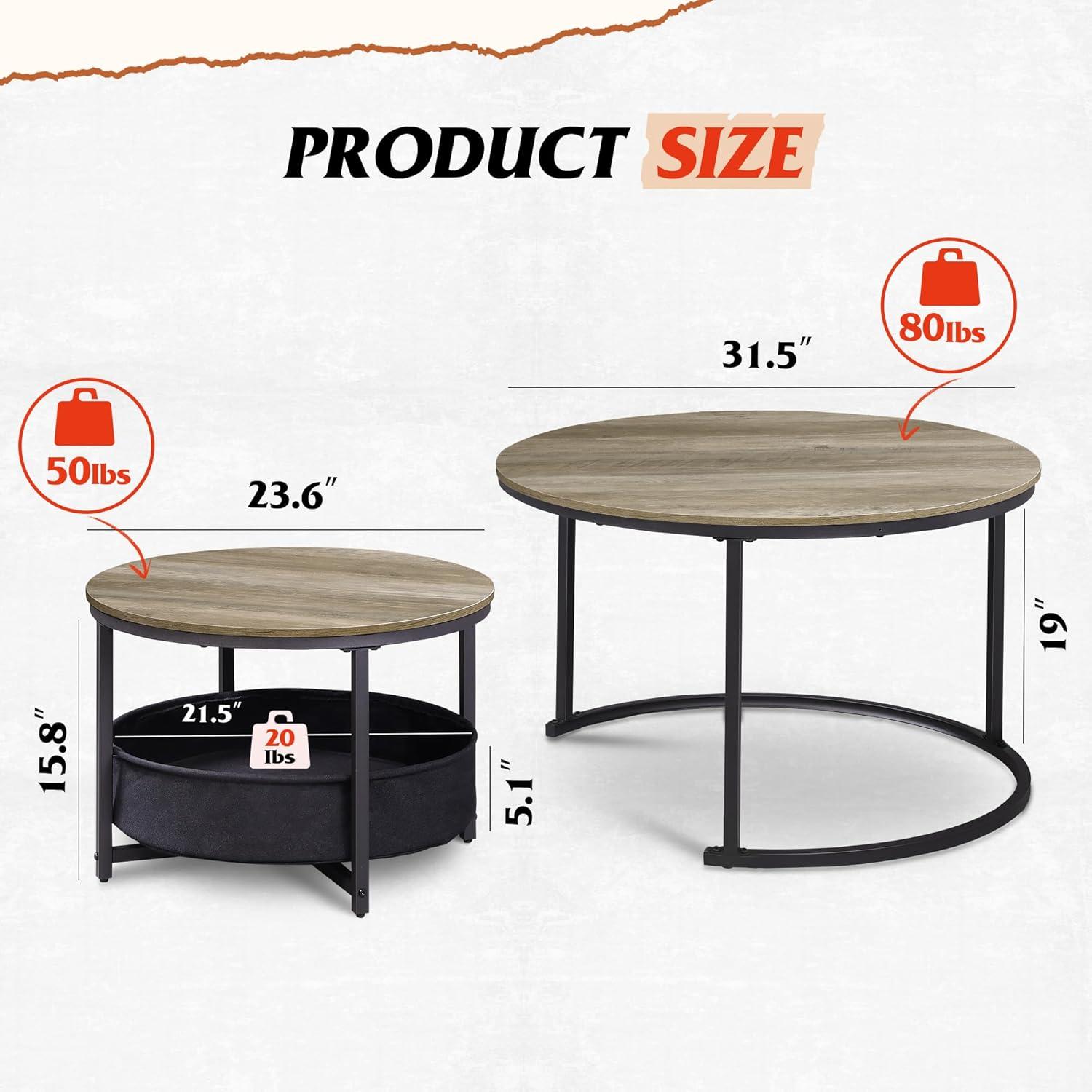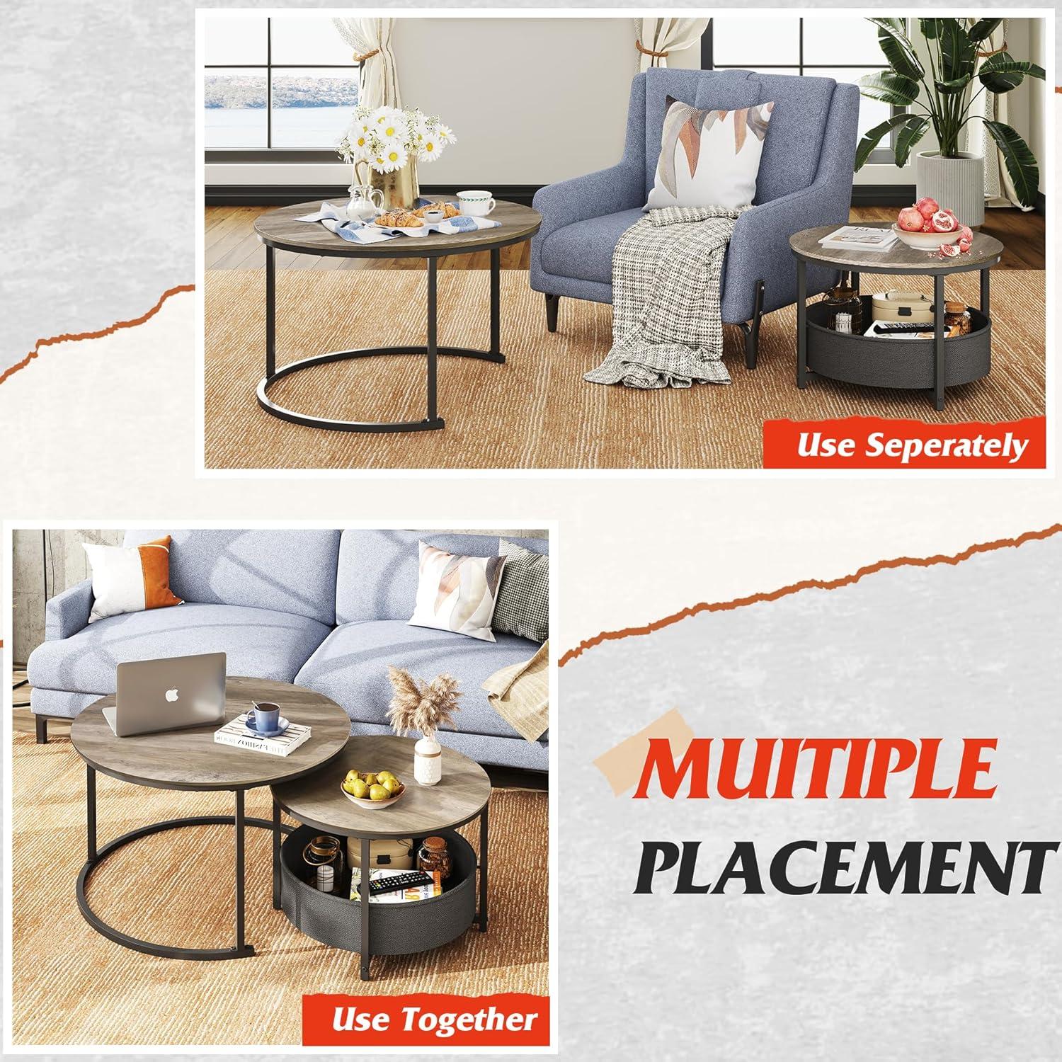 WLIVE Round Coffee Table Set of 2, 31.5" Nesting Coffee Table with Storage, Industrial Minimalist Center Table with Metal Frame, Easy Assembly for Living Room, Apartment, Grey(Greige)