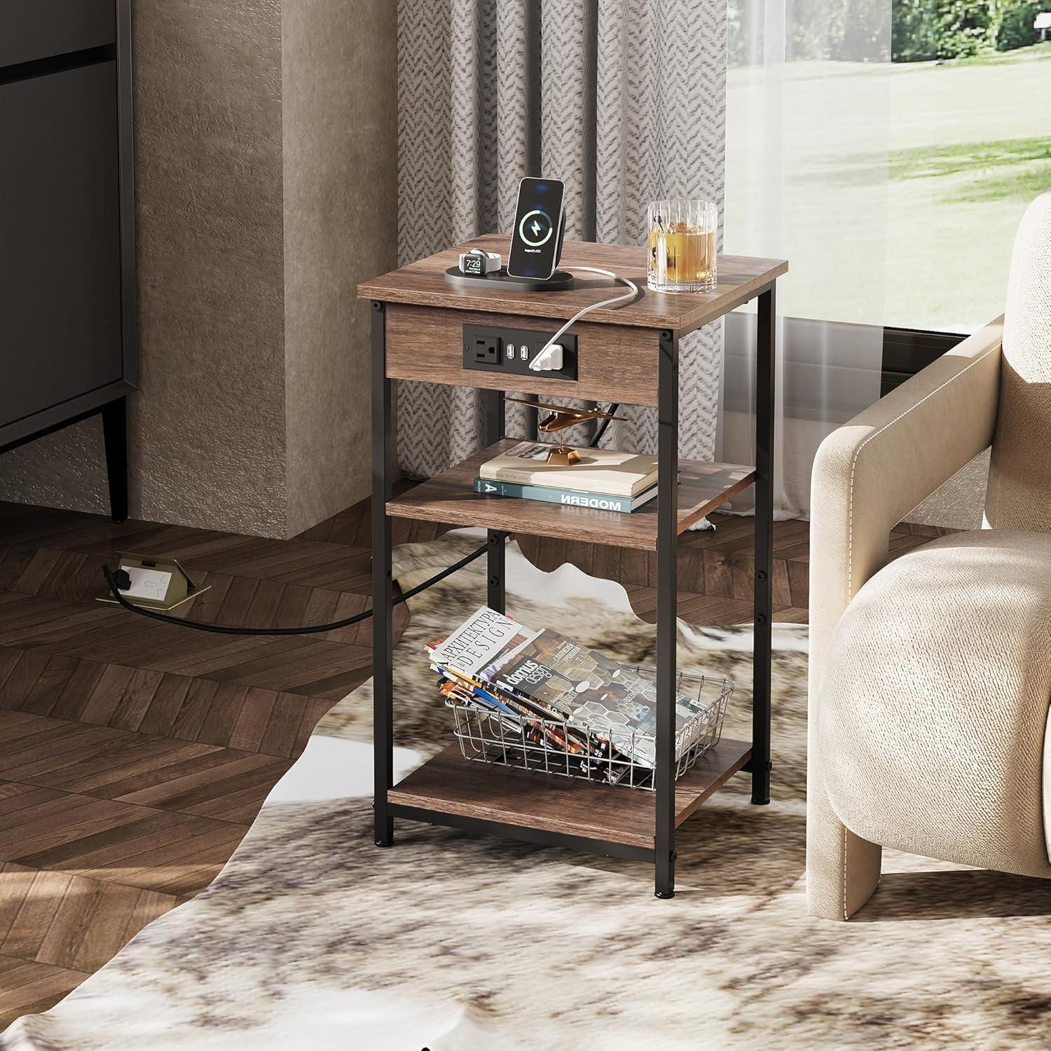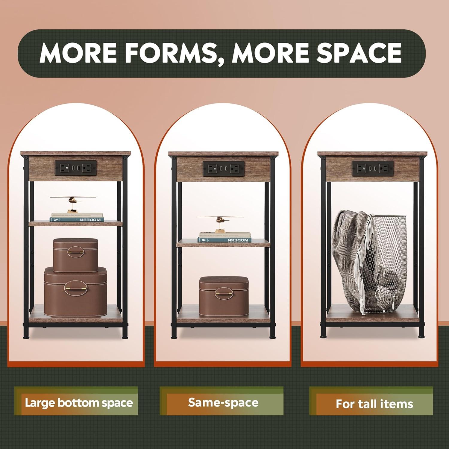 WLIVE Side Table with Charging Station and USB Ports, Small End Tables for Small Spaces, 3-Tier Nightstand with Adjustable Shelf, Bedside Tables, Living Room, Bedroom, Greige(Brown)
