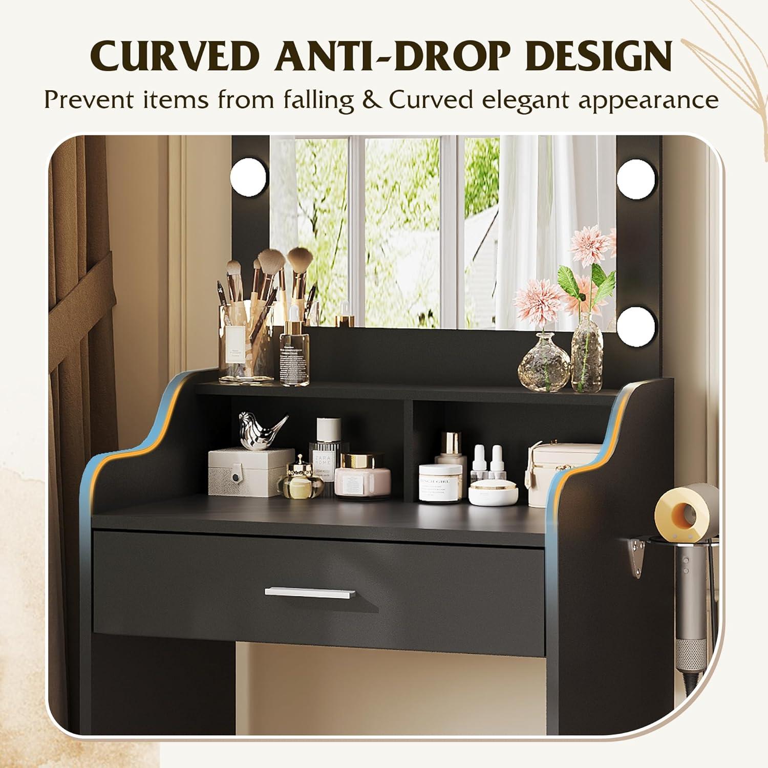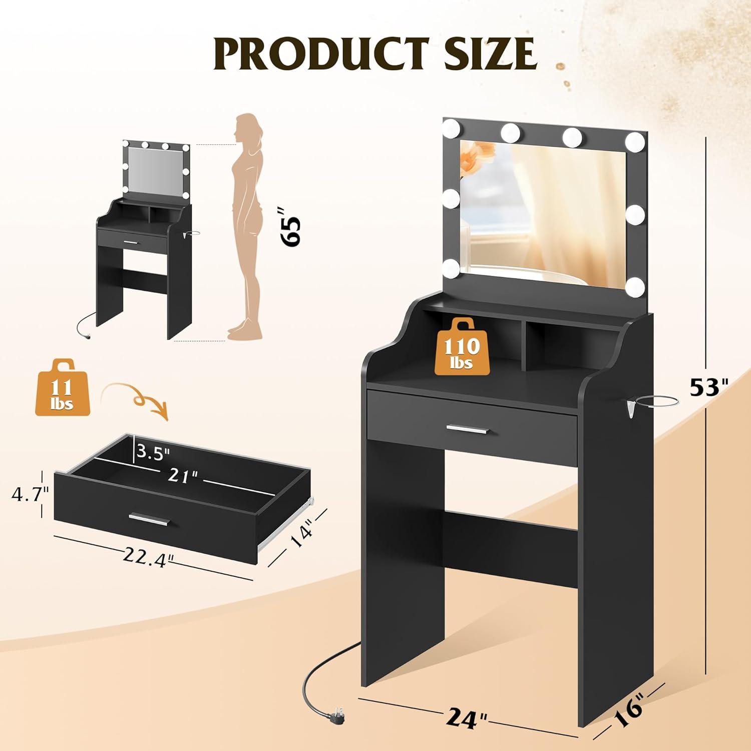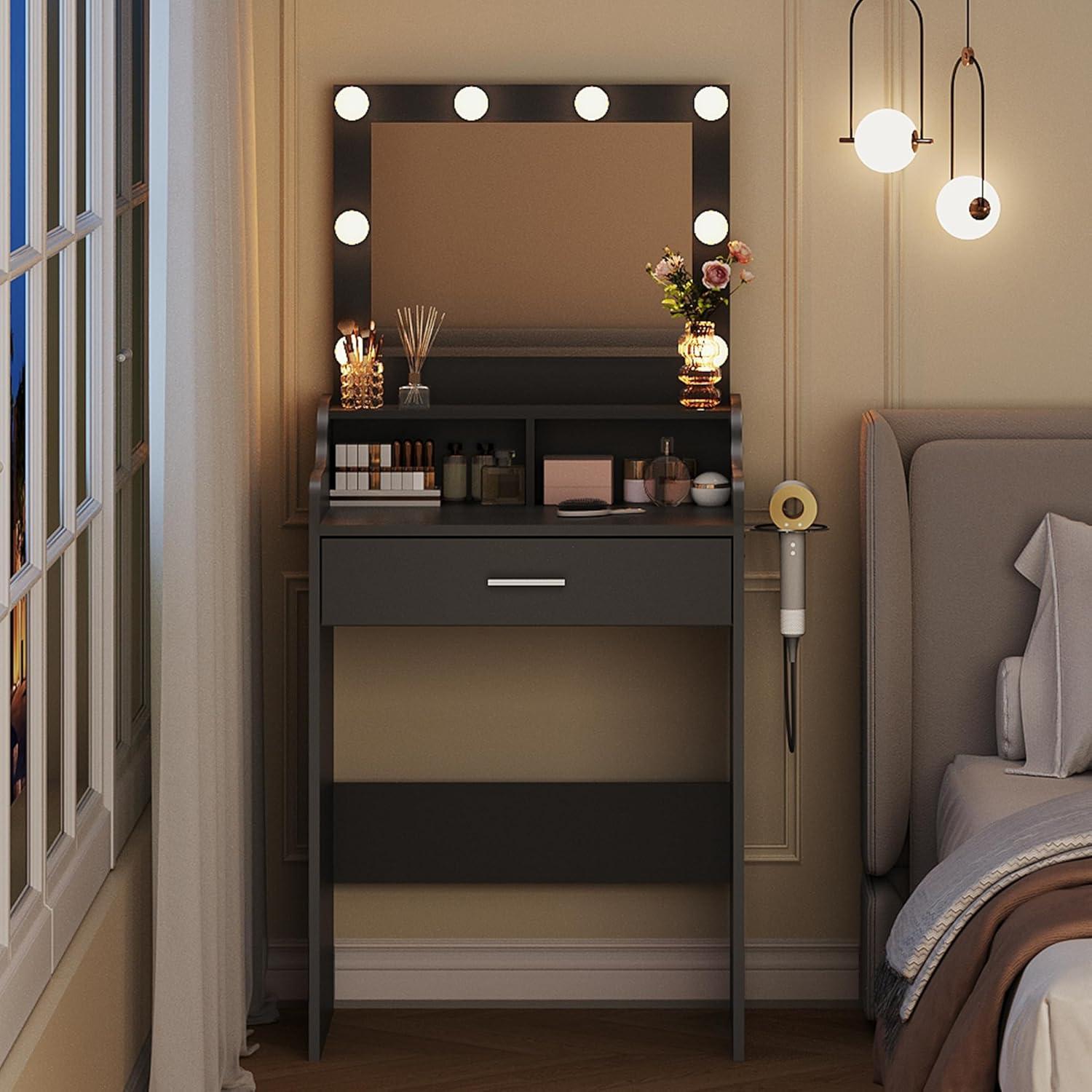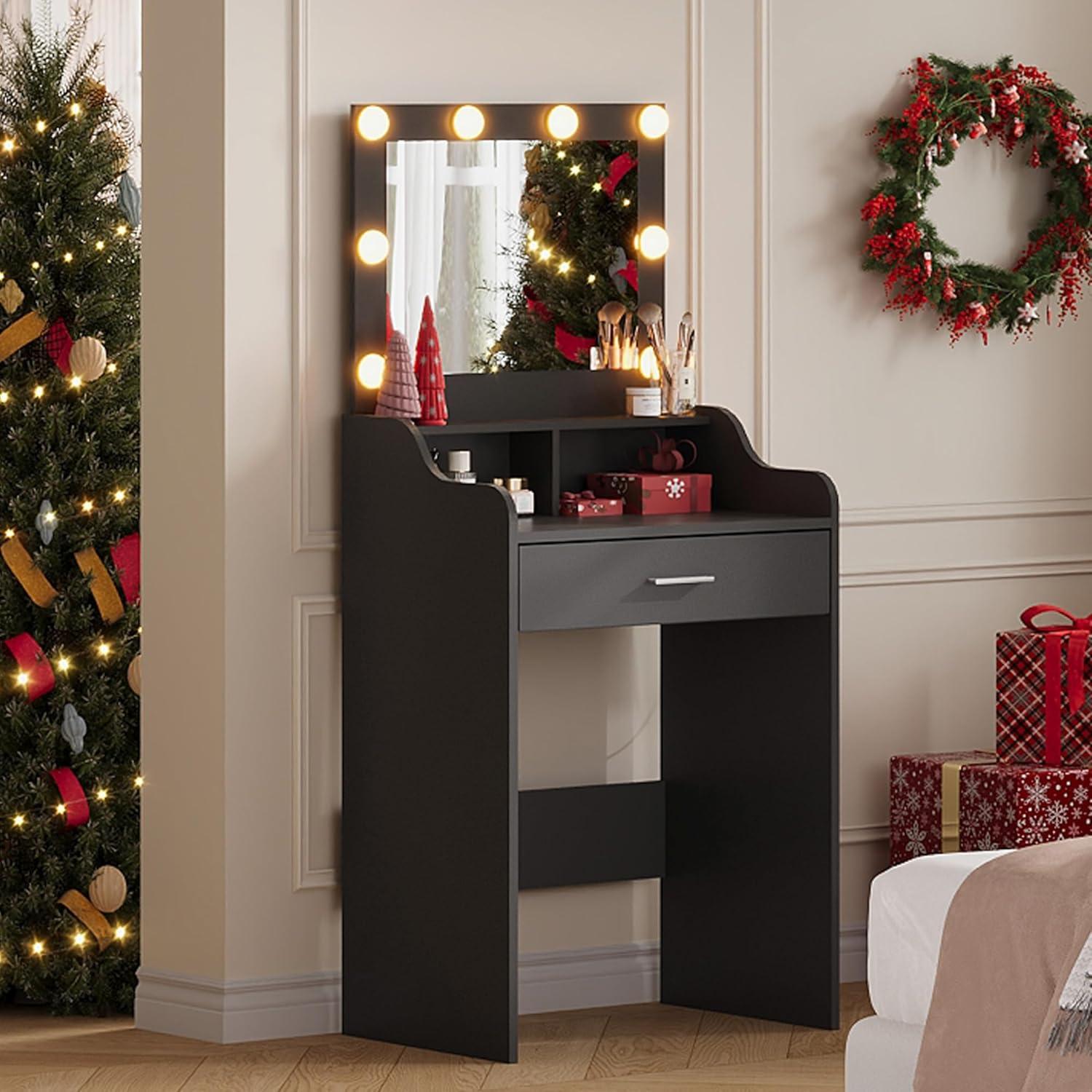 WLIVE Small Vanity Desk Set with Mirror & 3 Color Lighting Modes, 23.8” Makeup Table with Shelves and Storage Drawers for Bedroom, Compact Dressing Table and Storage Chair Set for Tiny Space, Black(Black)