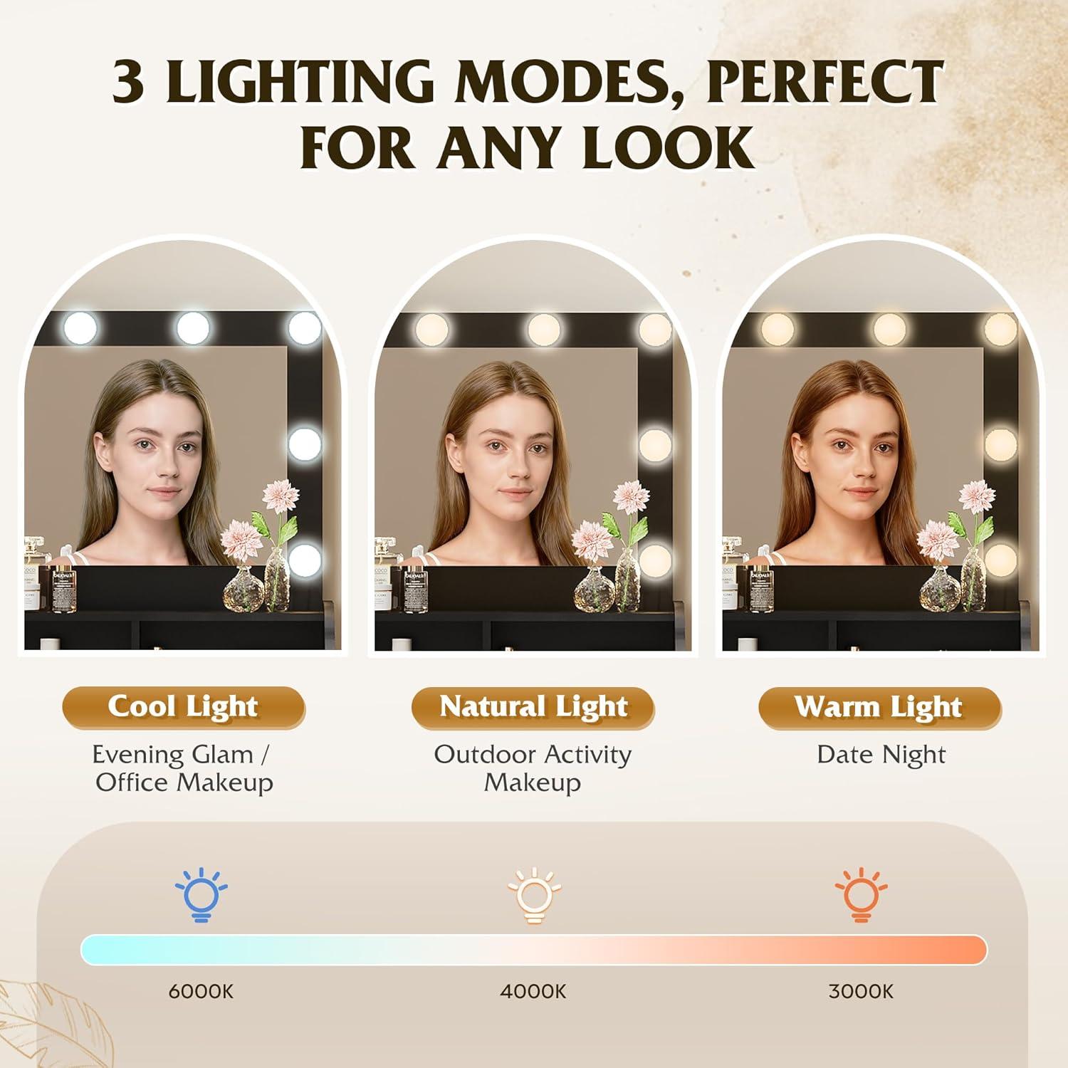 【3 Color Lighting Modes & 4mm Thickened Mirror】 This compact vanity desk features 8 LED beads and a premium 4mm extra-thick mirror that eliminates distortion. The touch-control lights offer natural, warm, and cool settings to perfectly match any lighting scenario—ensuring your makeup looks flawless anywhere.