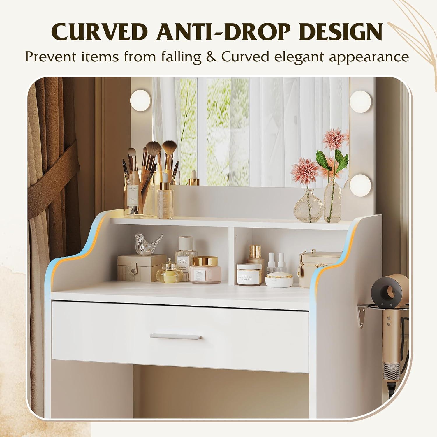 【Smart Storage, Surprising Capacity】 Our vanity makeup table features a 2-tier open shelf and one spacious drawer, offering a large amount of storage in a compact size. Perfectly store and organize your makeup collections, daily skincare essentials, and favorite accessories, keeping them all within reach while maintaining a clean, clutter-free space.