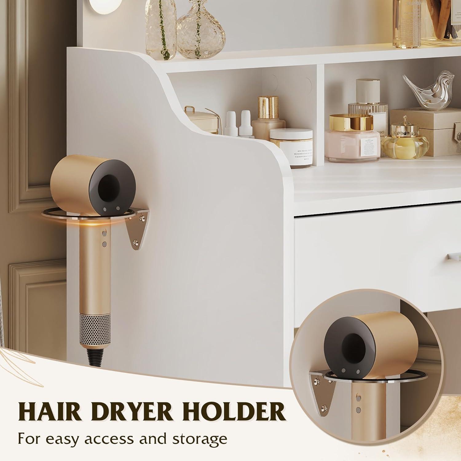 【Built-In Hair Dryer Holder】 Never search for a place to put your styling tools again. This dressing table comes with a hair dryer holder, conveniently located for immediate use after your beauty routine. Tuck away your dryer, curling iron, or other hot tools neatly and safely, keeping your hazard-free while maintaining a sleek appearance.