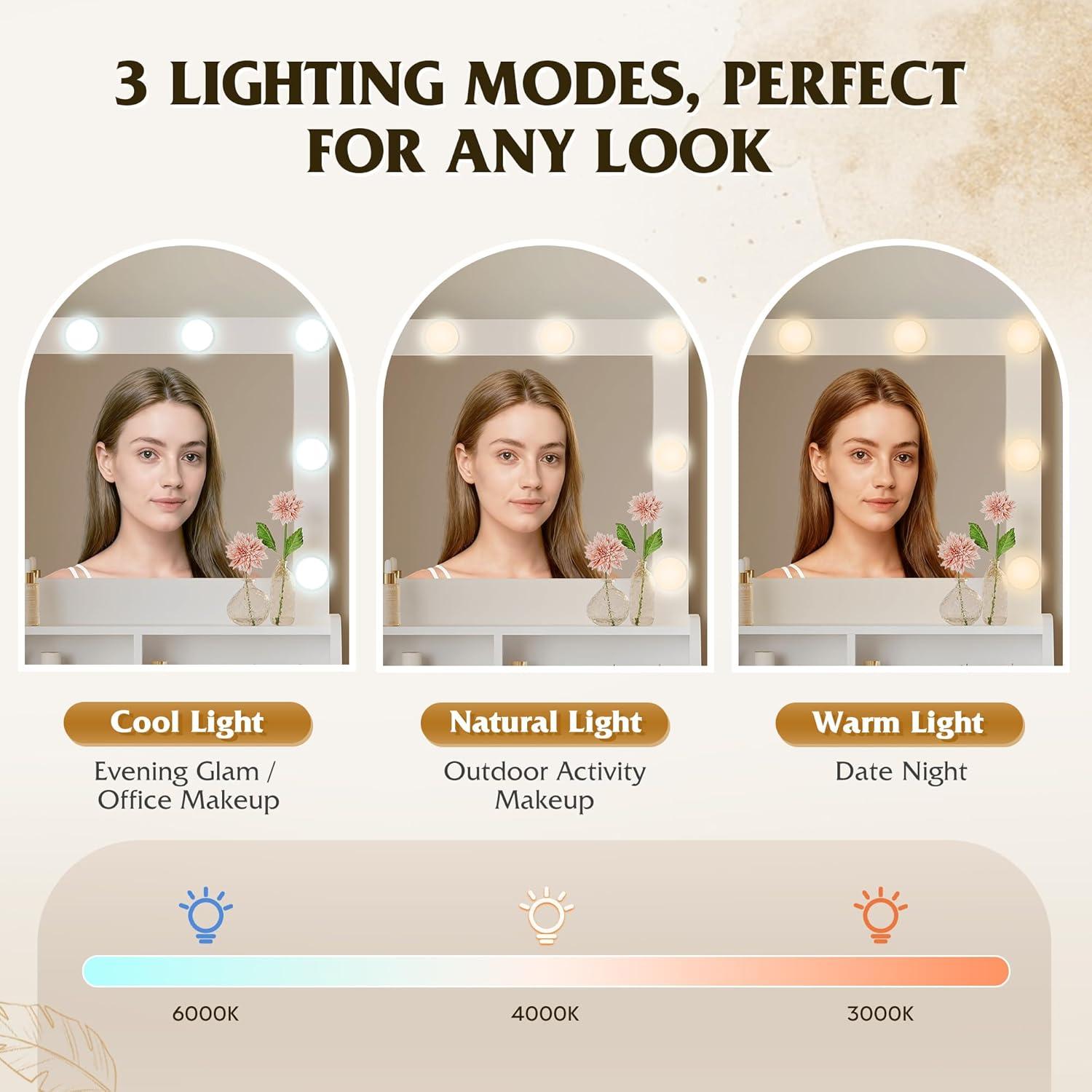 【3 Color Lighting Modes & 4mm Thickened Mirror】 This compact vanity desk features 8 LED beads and a premium 4mm extra-thick mirror that eliminates distortion. The touch-control lights offer natural, warm, and cool settings to perfectly match any lighting scenario—ensuring your makeup looks flawless anywhere.