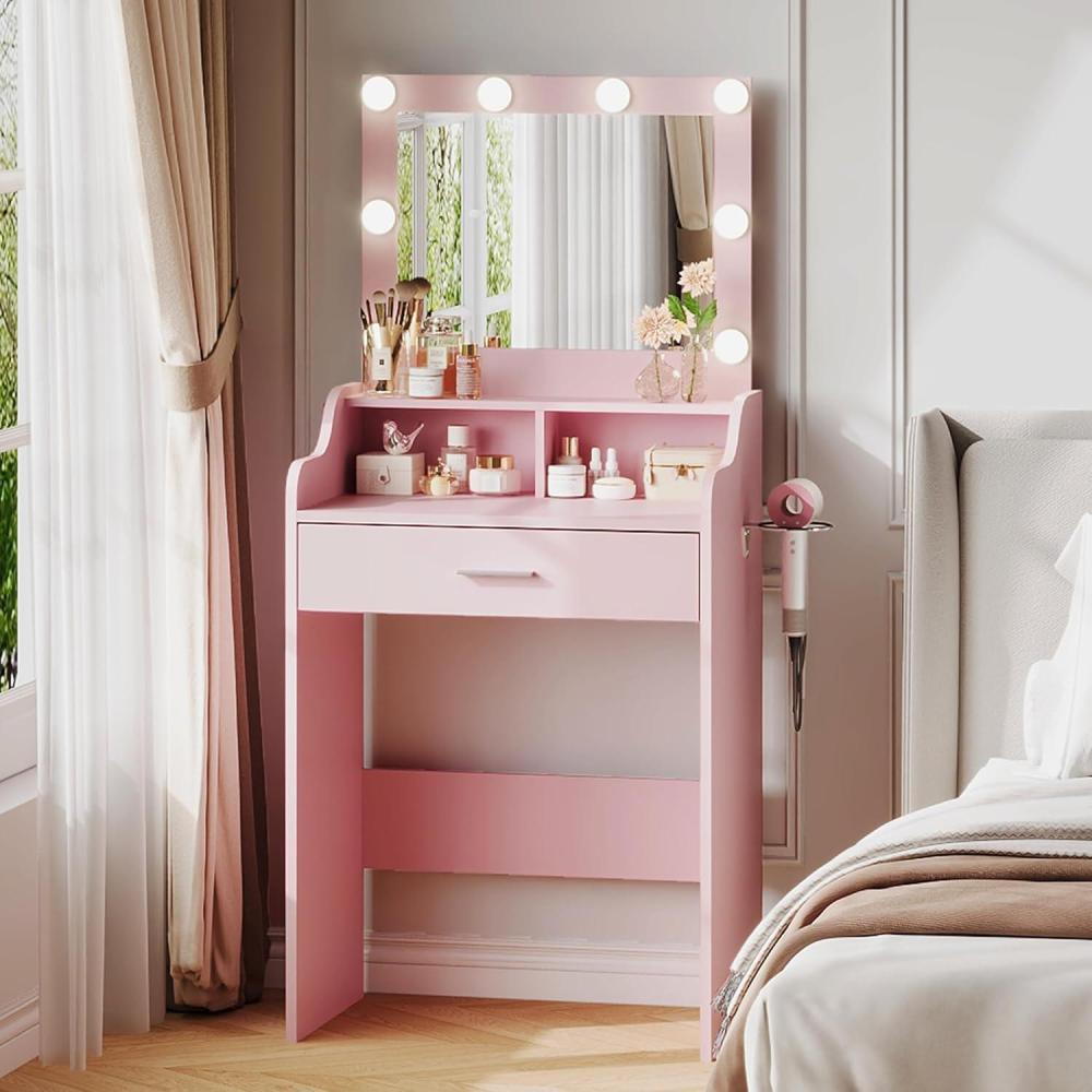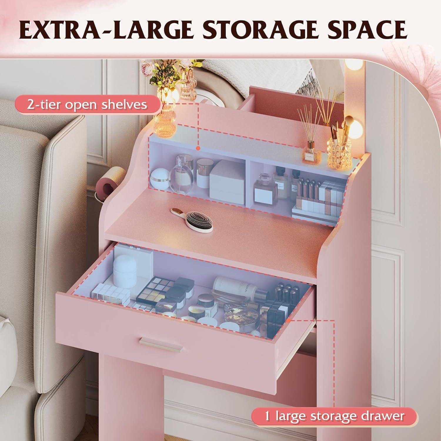 【Smart Storage, Surprising Capacity】 Our vanity makeup table features a 2-tier open shelf and one spacious drawer, offering a large amount of storage in a compact size. Perfectly store and organize your makeup collections, daily skincare essentials, and favorite accessories, keeping them all within reach while maintaining a clean, clutter-free space.