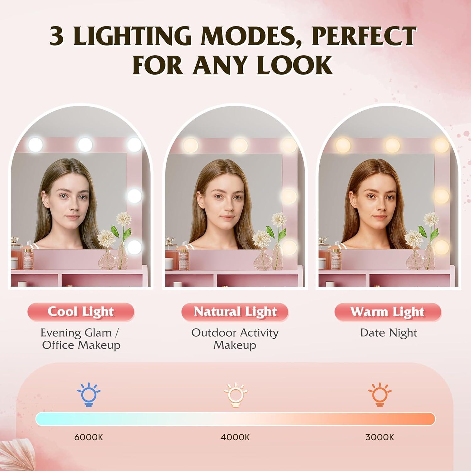 【3 Color Lighting Modes & 4mm Thickened Mirror】 This compact vanity desk features 8 LED beads and a premium 4mm extra-thick mirror that eliminates distortion. The touch-control lights offer natural, warm, and cool settings to perfectly match any lighting scenario—ensuring your makeup looks flawless anywhere.