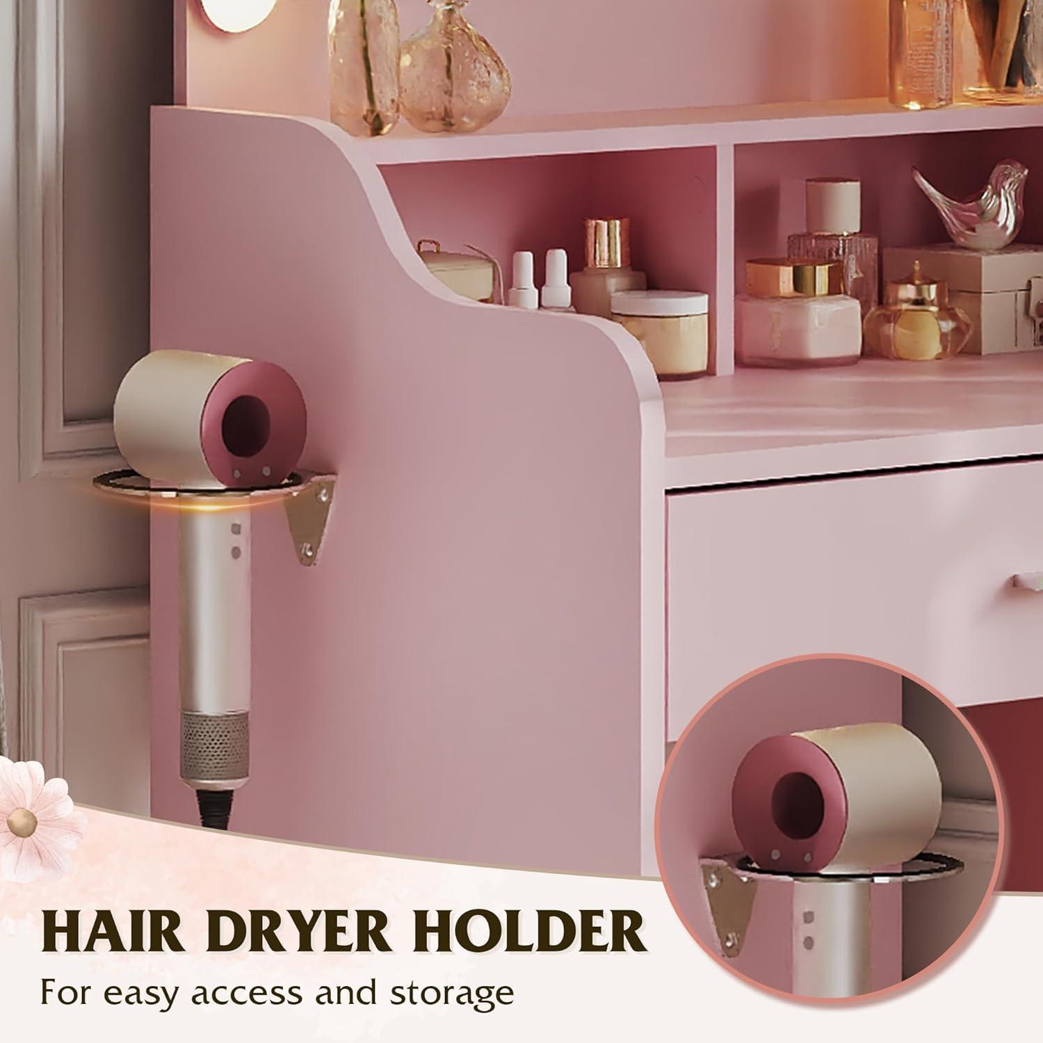 【Built-In Hair Dryer Holder】 Never search for a place to put your styling tools again. This dressing table comes with a hair dryer holder, conveniently located for immediate use after your beauty routine. Tuck away your dryer, curling iron, or other hot tools neatly and safely, keeping your hazard-free while maintaining a sleek appearance.