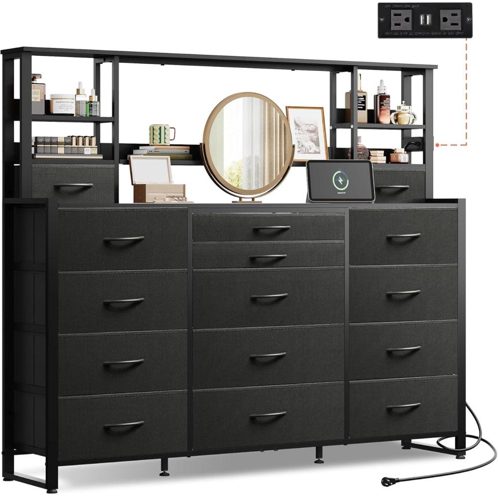imageWLIVE Storage Organizer Unit with 15 Fabric Drawer ampamp 5 Open Shelves Tall Black Storage Drawers Organizer with Charging Station Storage Tower Organizaton for Living Room Hallway OfficeBlack