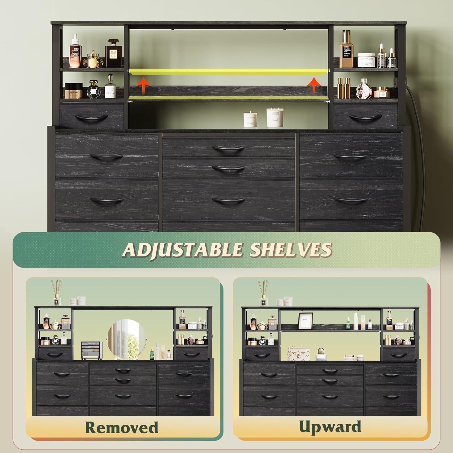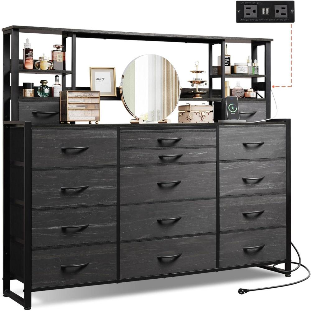 WLIVE Storage Organizer Unit with 15 Fabric Drawer & 5 Open Shelves, Tall Black Storage Drawers Organizer with Charging Station, Storage Tower Organizaton for Living Room, Hallway, Office(Charcoal Black Wood Grain Print)