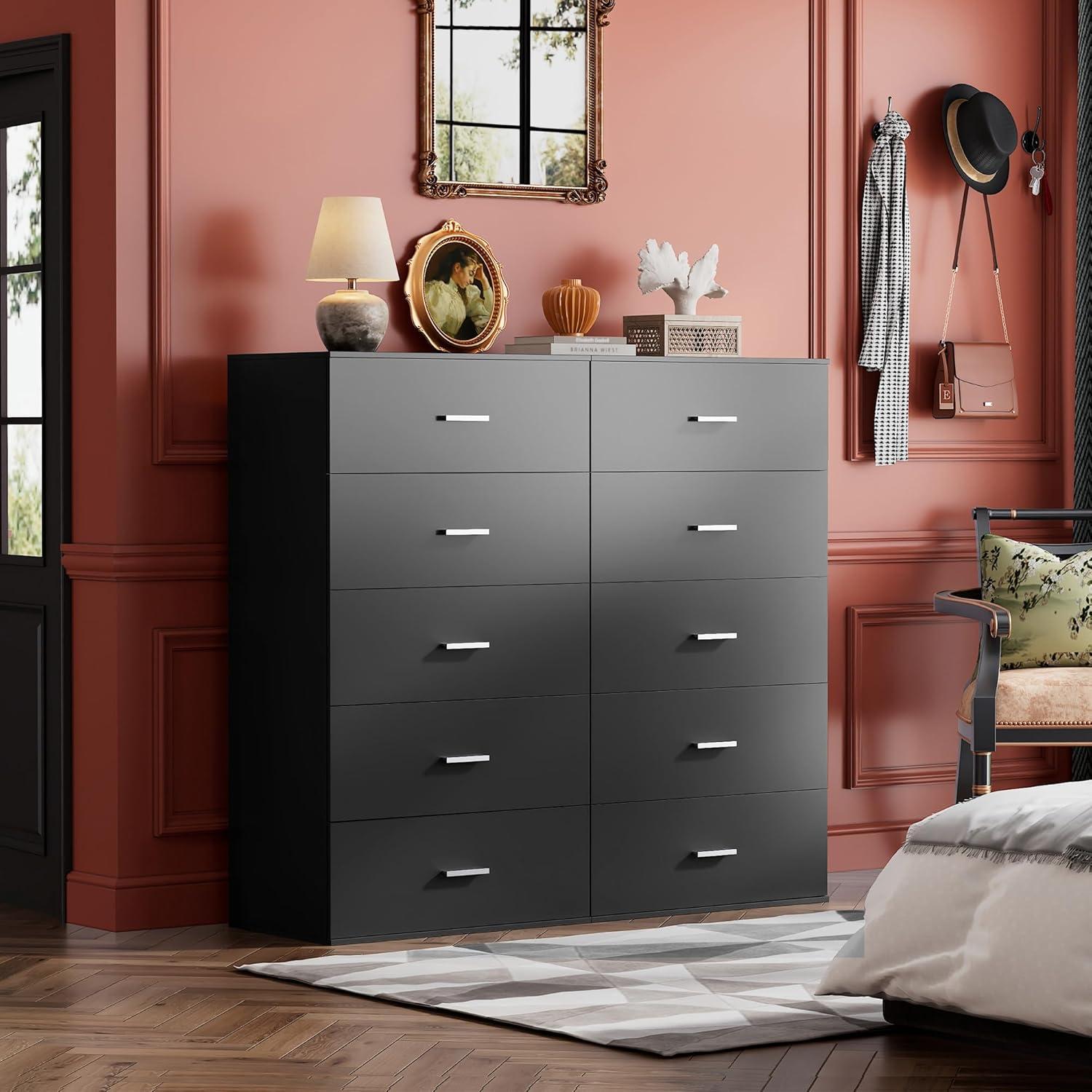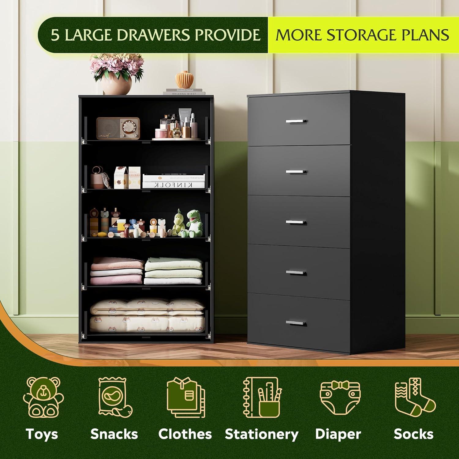 WLIVE Tall Dresser for Bedroom, Wood Chest of Drawers with Mental Handles, Black Bedroom Dresser with 5 Drawers, Modern Minimalist Closet Store Organizer for Living Room, Hallway(Black)