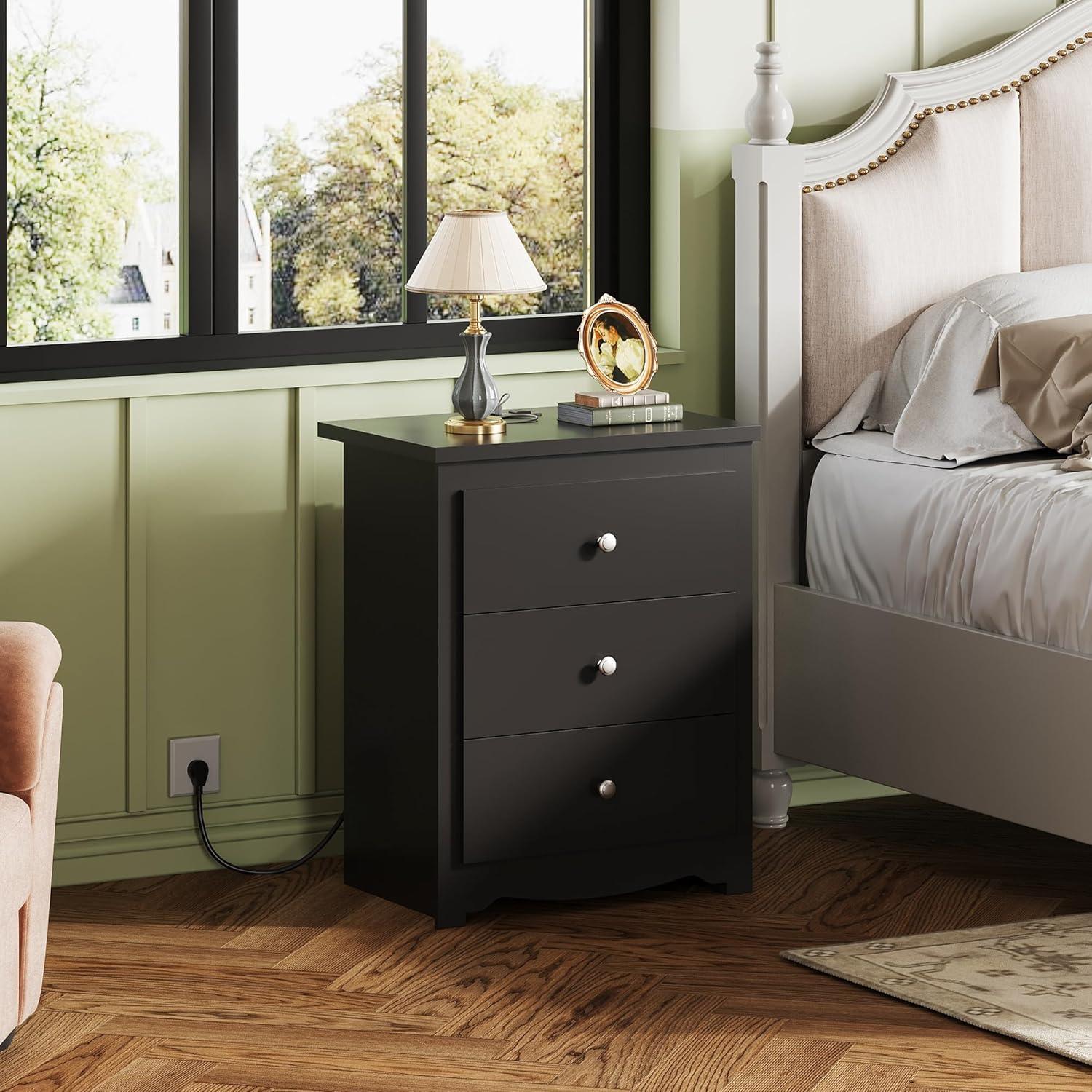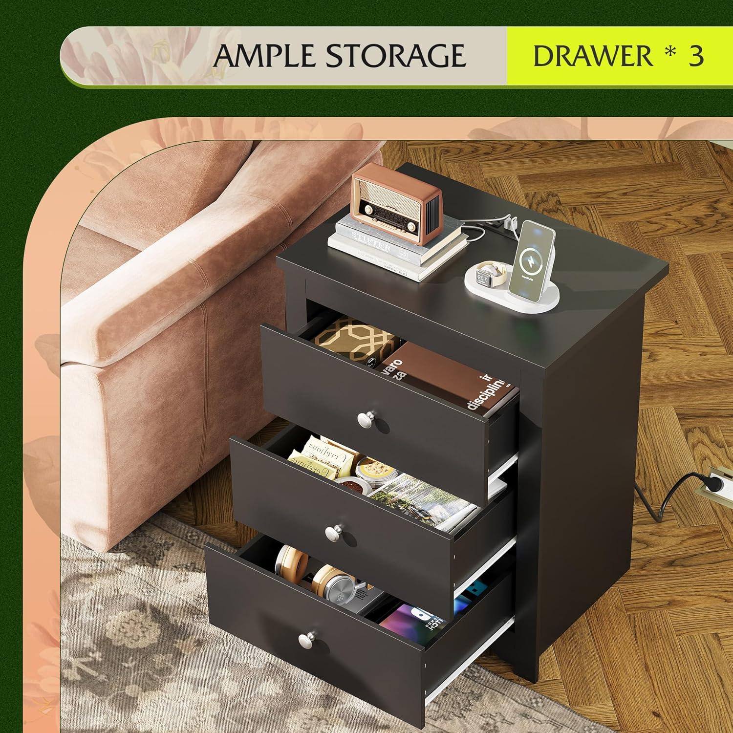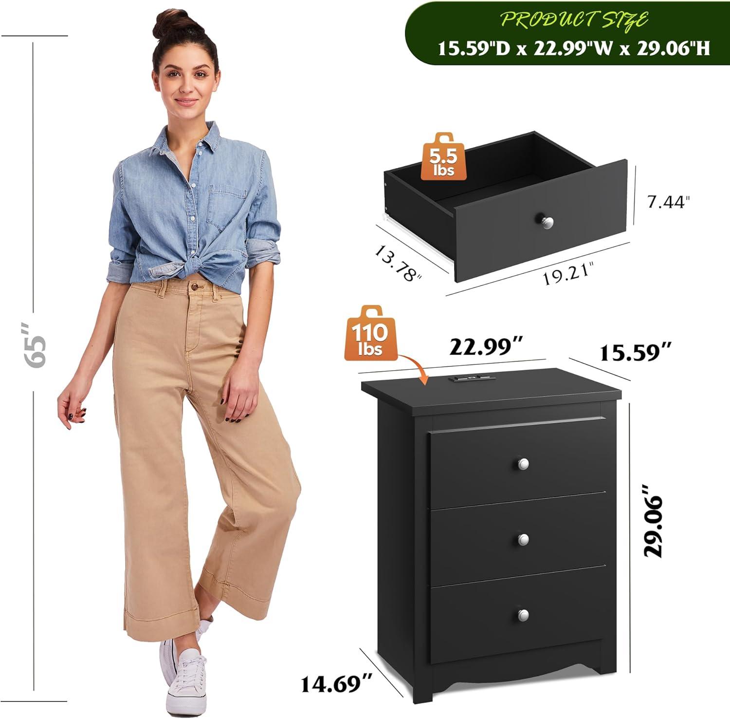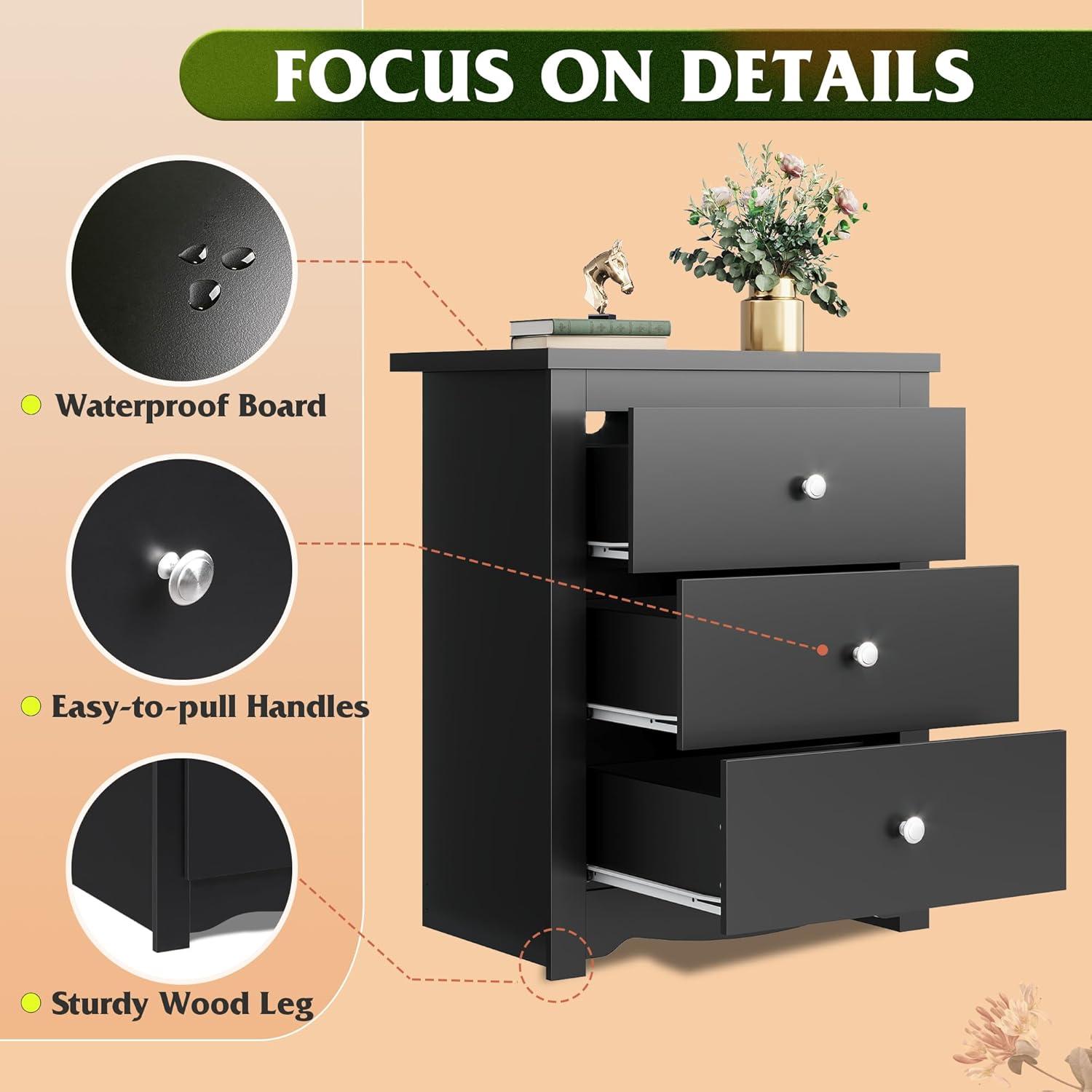 [Sturdy and Durable] This 3 drawer nightstand's weight capacity is 110 LBS,which cater to your daily needs. The steel frame structure effectively guarantee its stabilty and durability. Top of the wood dresser is made of water proof board, you can put coffee and other drinks on without worrying potential risks.