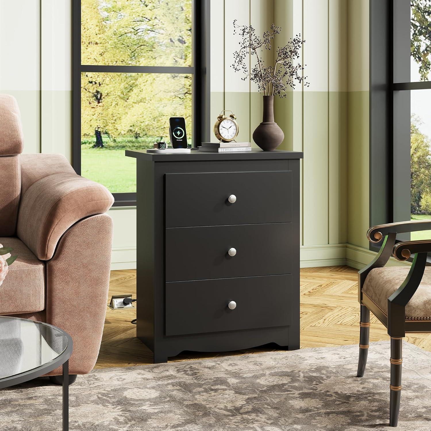 [Ample Storage Space] This tall side table has 3 drawers with silver handles for easy access. You can place it beside your bed to store clothes and toys or next to your sofa to keep magazines and headphones handy. The spacious top provides extra room for items or decorative pieces, meeting your storage needs while maintaining privacy.