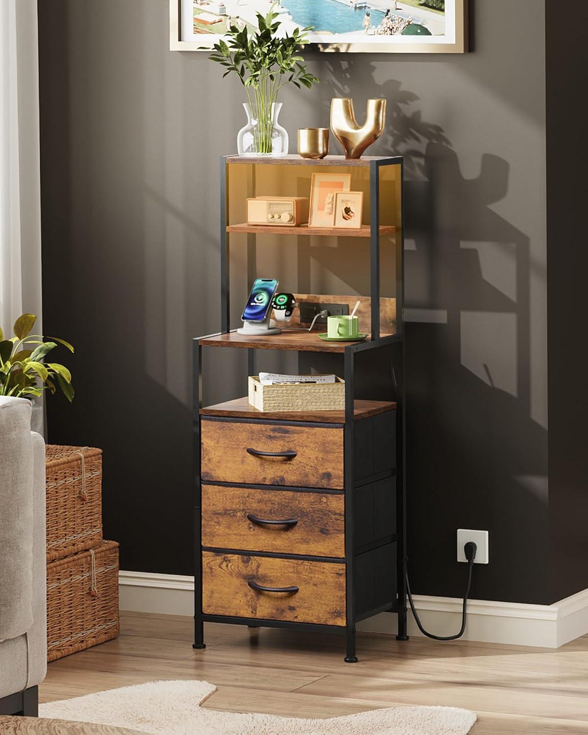 【Spacious Storage Organizer】This night stand offers 3 fabric drawers for lightweight clothing and open shelves for lamps, cups, or decor. A versatile storage cabinet for bedroom or living room.