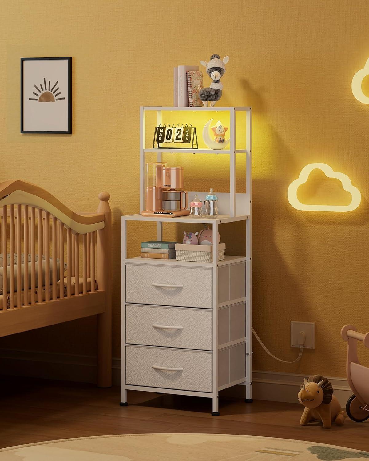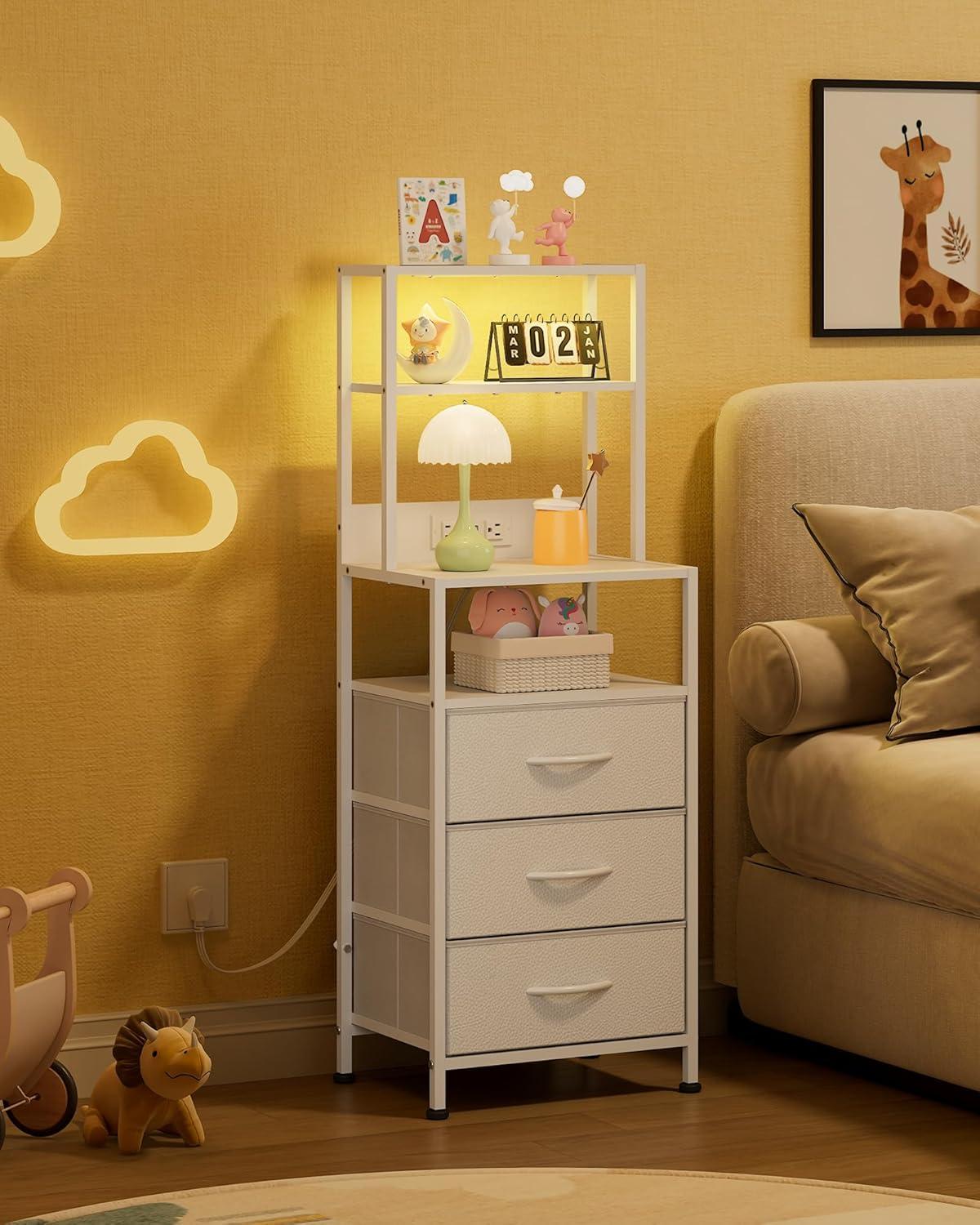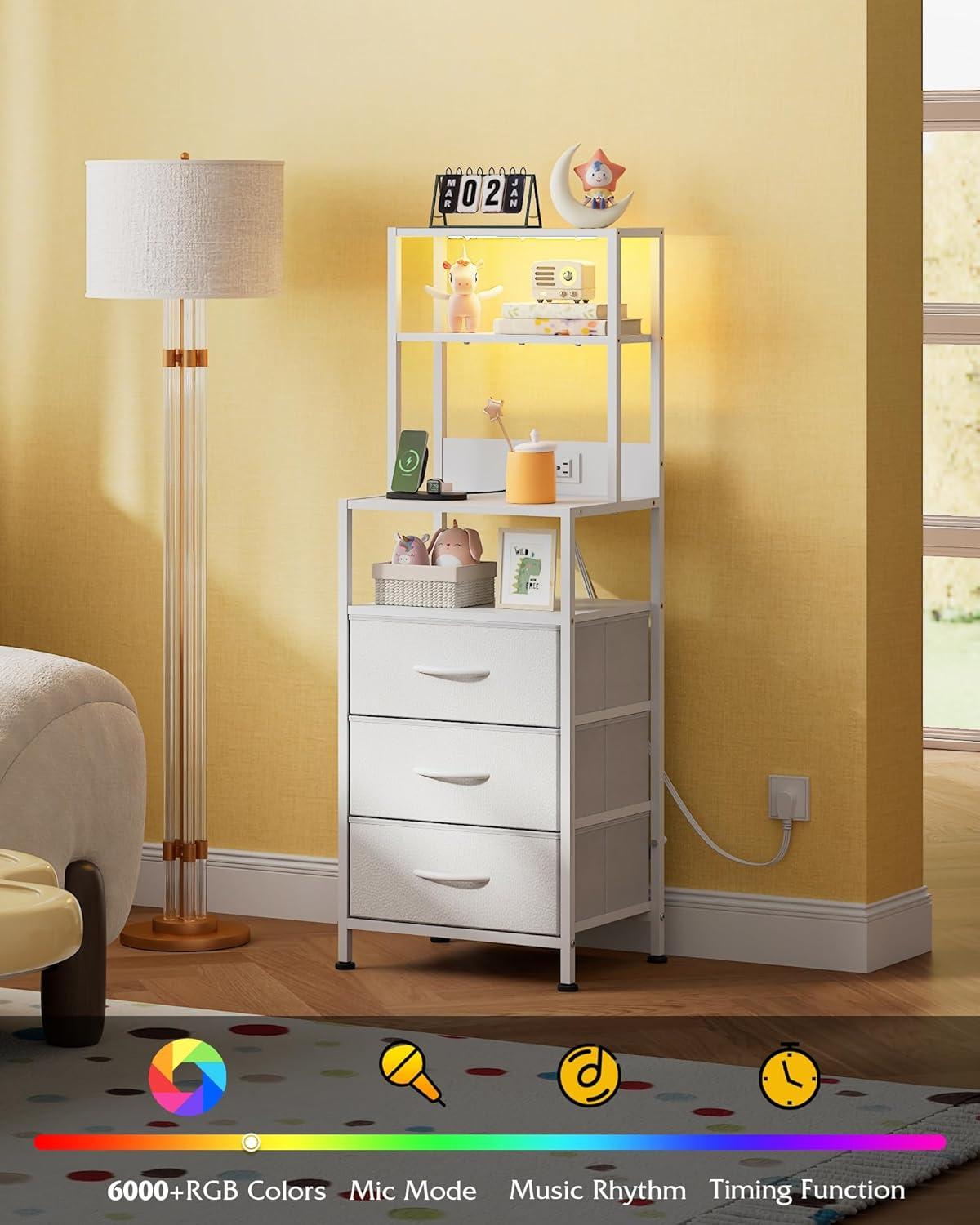 WLIVE Tall White Nightstand with Charging Station, LED Night Stand with 3 Fabric Drawers and Storage Open Shelves, Bedroom Nightstand Table, Bed Side Table for Living Room(White)